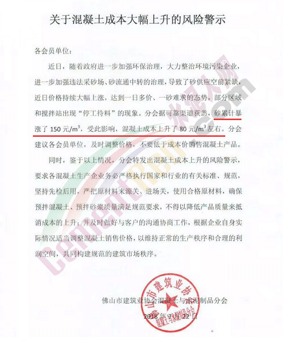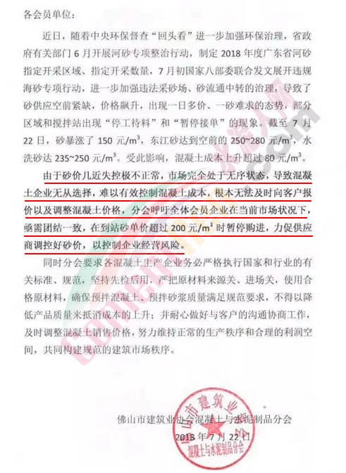 通知稱,隨著政府進一步加強環保治理,大力整治環境污染企業,進一步加強違法采砂場、砂流通中轉的治理,導致了砂供應空前緊缺,近日持續大幅上漲,達到一日多價、一砂難求的態勢,部分區域攪拌站出現“停工待料”和“暫停接單”的現象。