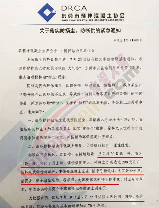 東莞市預拌混凝土協會發布關于落實防揚塵、防斷供的緊急通知,通知稱環保高壓態勢日趨嚴格,7月23日協會接到市住建局緊急通知,東莞市攪拌站已被東莞環保組“大氣辦”、東莞市安監站列為常態監控對象,重點治理攪拌站“揚塵”現象。