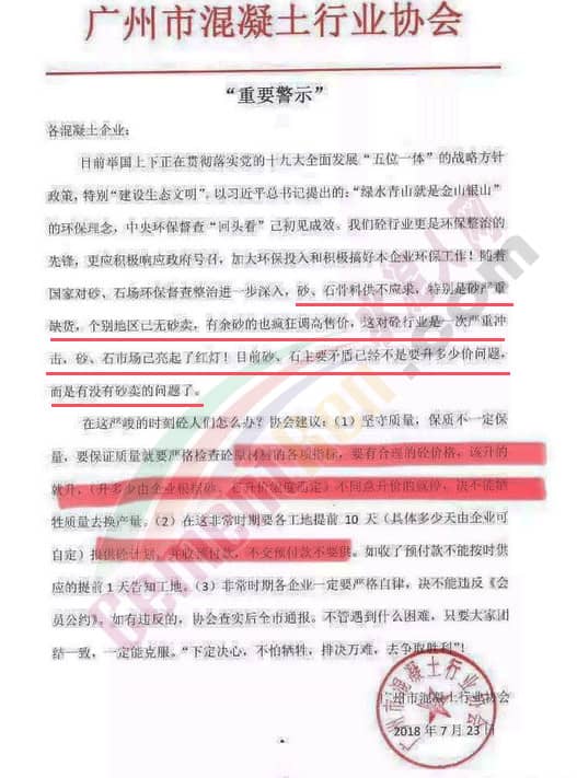 廣州市混凝土行業協會發布“重要警示”稱,隨著國家對砂、石場環保督查整治進一步深入,砂、石骨料供不應求,特別是砂嚴重缺貨,個別地區已經無砂可賣,有余砂的也瘋狂調高售價,這對砼行業是一次嚴重沖擊,砂石市場已亮起了紅燈!目前砂、石主要矛盾已經不是升多少價問題了,而是有沒有砂賣的問題了。