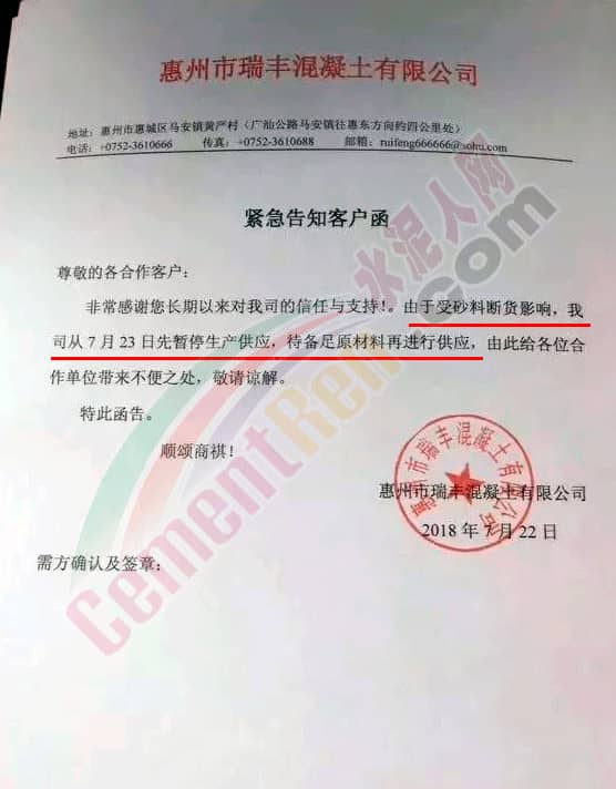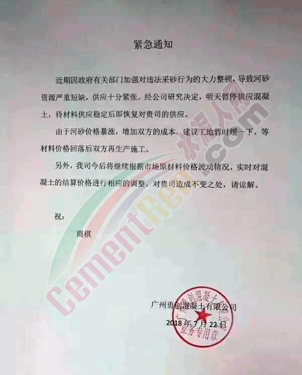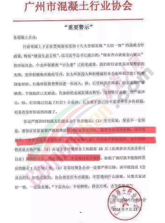 2、考慮到目前砂的供應市場供不應求的局面,從2018年7月25日0點開始,全市所有混凝土企業執行“先款后貨”的供貨模式,施工單位原則上應提前7天(具體天數由企業自定)向簽訂混凝土企業提交混凝土需求計劃,并支付預拌混凝土和濕拌砂漿預付款供混凝土企業采購原材料組織生產;混凝土企業在收到施工方支付的預付款后,如因原材料供應不足不能保證供應時,應至少提前一天告知工地。