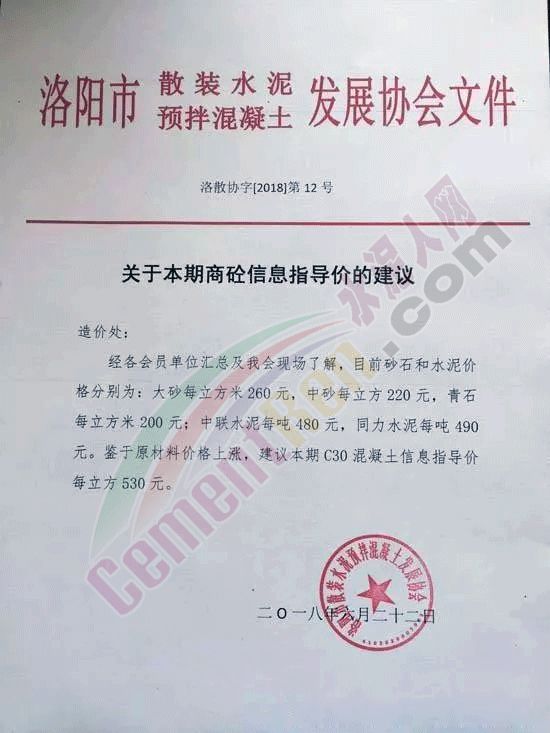 洛陽市散裝水泥預拌混凝土發展協會發布關于本期商砼信息指導價的建議,建議稱,經各會員單位匯總及協會現場了解,目前砂石和水泥價格分別為:大砂每立方米260元,中砂每立方220元,青石每立方200元,中聯水泥480元/噸,同力水泥490元/噸,鑒于原材料價格上漲,建議本期C30混凝土信息指導價每立方530元。
