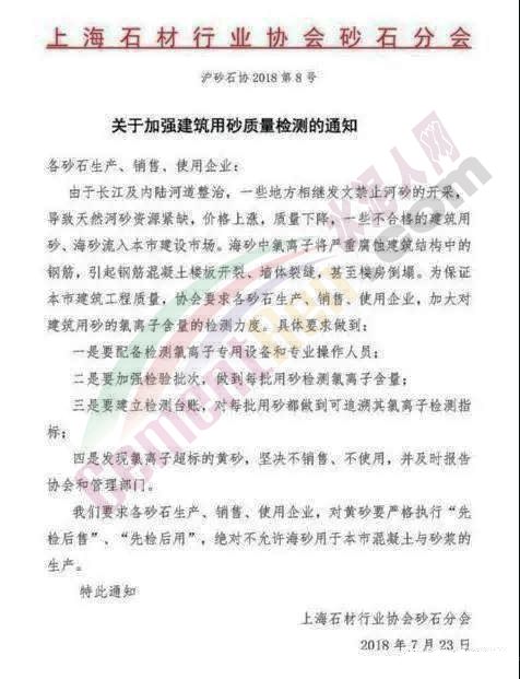 近日,上海市混凝土行業協會發布緊急通知,要求各預拌混凝土生產企業、預拌砂漿企業加大用砂的氯離子含量檢測力度,禁止使用海砂用于生產。要求全市所有預拌混凝土生產企業、干混砂漿生產企業嚴把質量關,原材料要嚴格執行“先檢后用”,絕對不允許海砂用于混凝土與砂漿的生產。