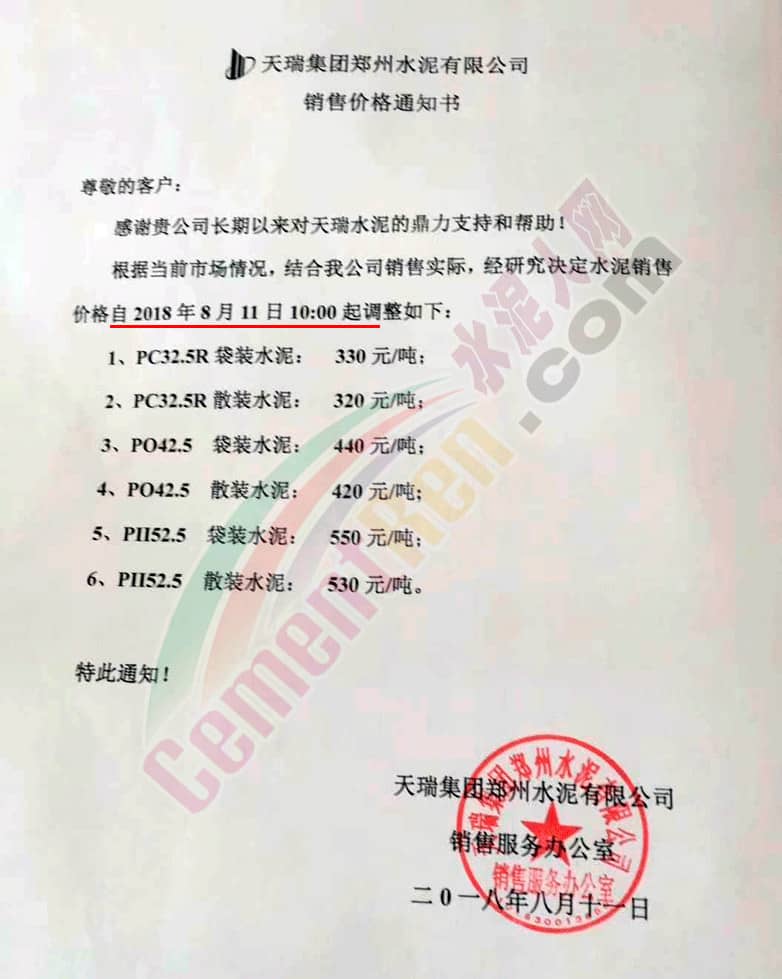 其中:天瑞集團(tuán)鄭州水泥有限公司銷售價(jià)格通知書(shū)稱,根據(jù)當(dāng)前市場(chǎng)情況,結(jié)合公司銷售實(shí)際,決定上調(diào)水泥銷售價(jià)格,自8月11日10點(diǎn)起執(zhí)行新價(jià)格。