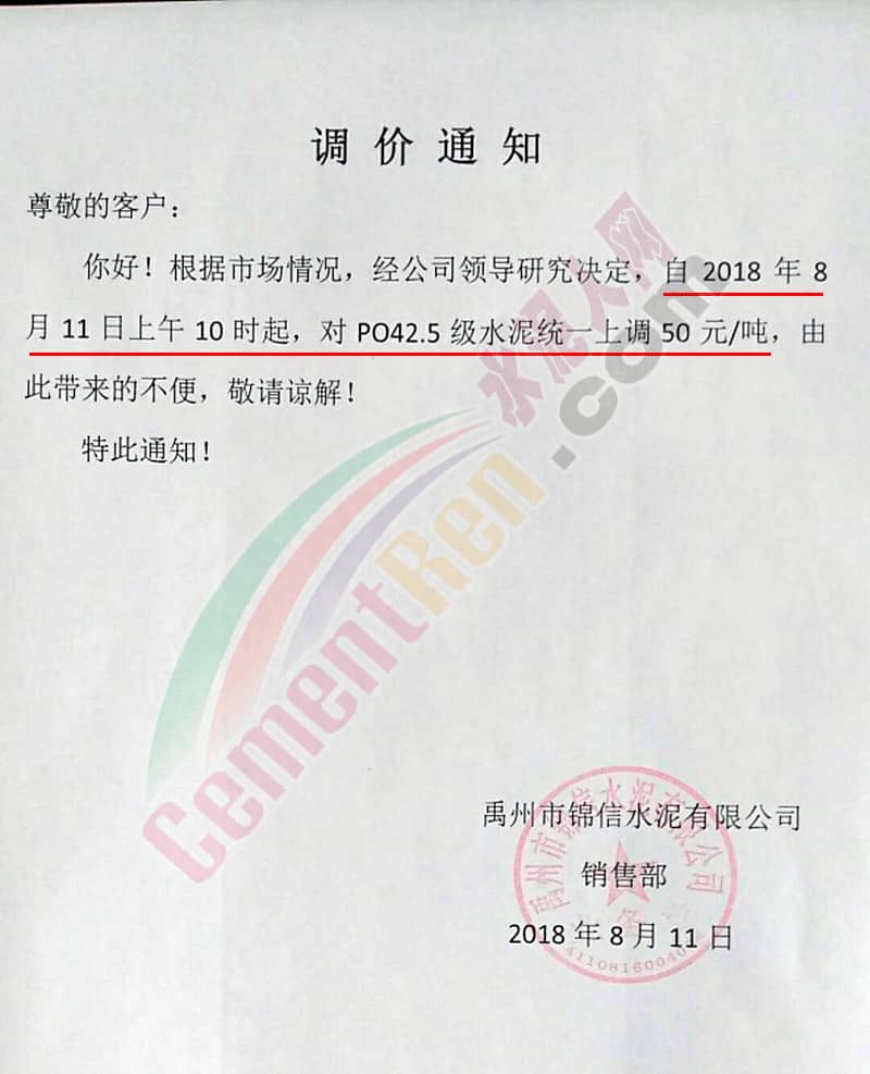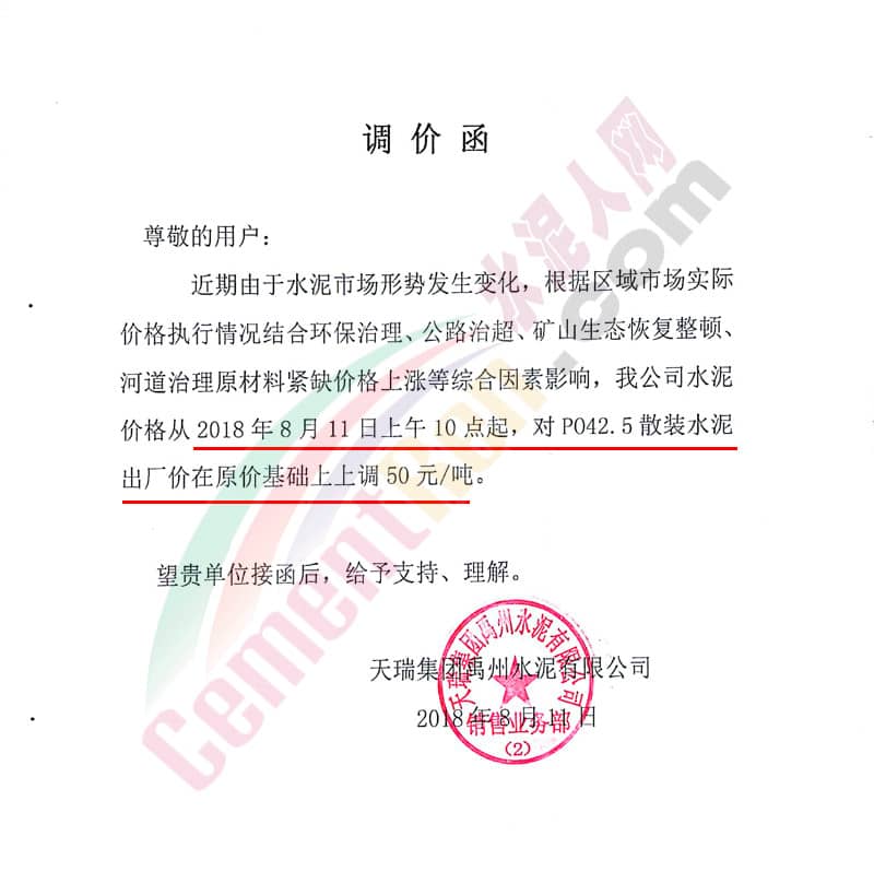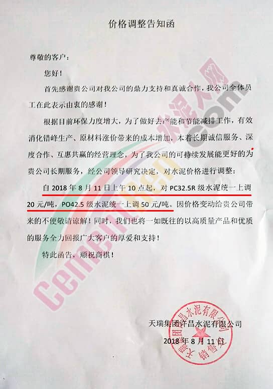 天瑞集團(tuán)許昌水泥有限公司價(jià)格調(diào)整告知函稱,根據(jù)目前環(huán)保力度增大,為了做好去產(chǎn)能和節(jié)能減排工作,有效消化錯(cuò)峰生產(chǎn)、原材料漲價(jià)帶來(lái)的成本增加,本著長(zhǎng)期誠(chéng)信服務(wù)、深度合作、互惠共贏的經(jīng)營(yíng)理念,為了公司的可持續(xù)發(fā)展,自2018年8月11日上午10點(diǎn)起對(duì)PC32.5R級(jí)水泥統(tǒng)一上調(diào)20元/噸,PO42.5級(jí)水泥統(tǒng)一上調(diào)50元/噸。