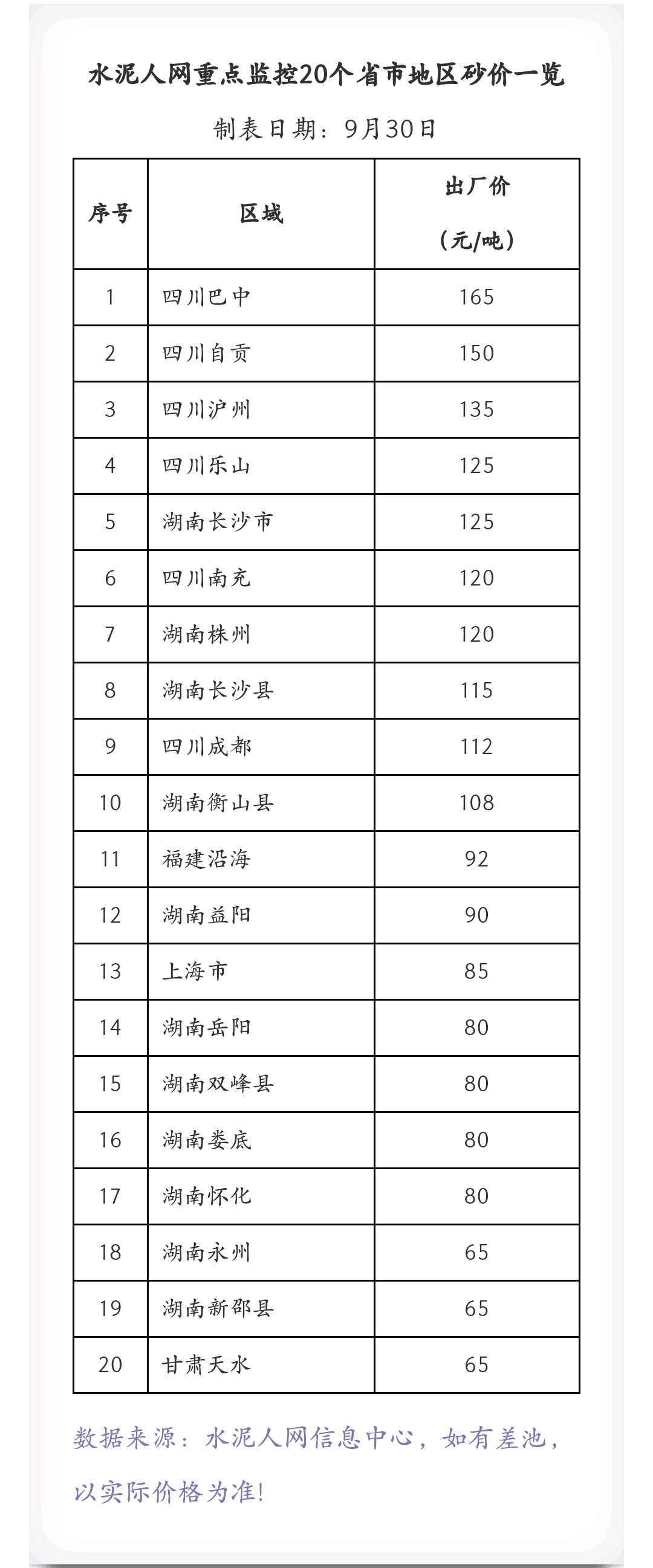 水泥人網重點監控的20個省市地區中有一半區域機制砂價格達到100元/噸以上,其余十家企業機制砂價也在60元/噸以上,相比上年同期均有大幅上漲。