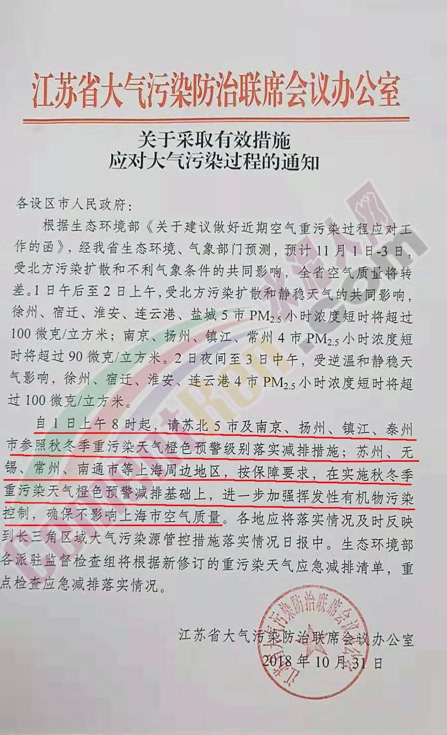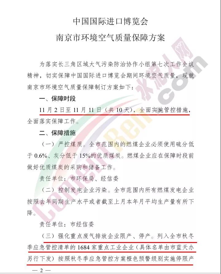 保障時段從11月2日至11月11日(共10天),全面實施管控措施,全面落實保障工作。保障措施中提到,強化重點廢氣排放企業限產、停產。列入全市秋冬季應急管控清單的1684家重點工業企業按照秋冬季應急管控方案橙色預警實施停限產或錯峰生產,減排40%。對于未列入秋冬季應急管控清單的涉氣工業企業,各區(園區)進一步摸排,列出詳細清單,全部實施停產。工業企業不得進行設備、管道清洗、清掃、放空等可能產生廢氣污染的維修保養作業。