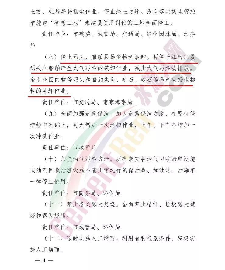 同時要加強機動車污染管控,全市范圍內工業企業柴油貨車全部停止運輸和作業作裝卸作業。全市范圍內暫停沙石等易揚塵污染的物料運輸;暫停自卸車傾倒作業。停止碼頭船舶易揚塵物料裝卸。暫停長江南京段碼頭和船舶產生大氣污染的裝卸作用,減少大氣污染物排放。全市范圍內暫停碼頭和船舶煤炭、礦石、砂石等易產生揚塵物料的裝卸作業。