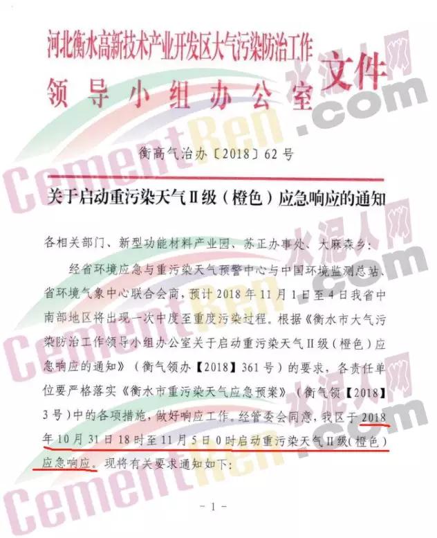 10月31日,河北衡水高新技術產業開發區大氣污染工作領導小組辦公室發布《關于啟動重污染天氣II級(橙色)應急響應的通知》稱,經省環境應急與重污染天氣預警中心與中國環境監測總站、省環境氣象中心聯合商,預計2018年11月1日至4日我省中南部地區將出現一次中度至重度污染過程,根據《衡水市大氣污染防治工作領導小組辦公室關于啟動重污染天氣II級(橙色)應急響應的通知》要求,工業企業按照“一廠一策”采取停產、限產、輪流停產、降低生產負荷和加強污染治理等措施實現應急減排。