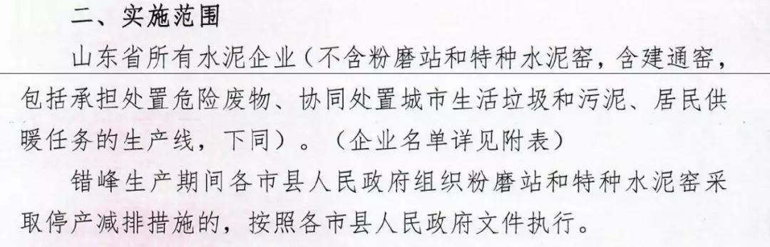 山東省的錯(cuò)峰生產(chǎn)方案針對(duì)于前兩年錯(cuò)峰生產(chǎn)中的“特權(quán)政策”做了專門(mén)的解讀,方案中明確水泥窯協(xié)同處置固廢、危廢及居民供暖等在采暖季結(jié)束后均要補(bǔ)齊相應(yīng)停窯時(shí)間。