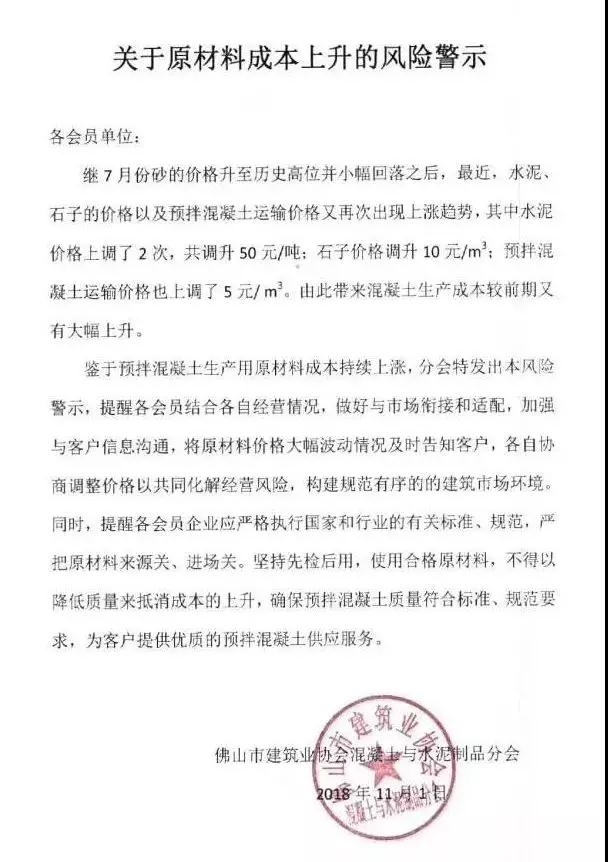 水泥行業(yè)在短短的一個(gè)月的時(shí)間內(nèi),一百多家水泥企業(yè)發(fā)布了幾輪漲價(jià)通知,價(jià)格漲幅可觀,已經(jīng)造成部分地區(qū)出現(xiàn)停工現(xiàn)象。佛山市建筑業(yè)協(xié)會(huì)混凝土與水泥制品分會(huì)發(fā)布了《關(guān)于原材料成本上升的風(fēng)險(xiǎn)警示》文件,文件稱因近期水泥、石子價(jià)格及預(yù)拌混凝土運(yùn)輸價(jià)格上漲,混凝土企業(yè)生產(chǎn)成本大幅上漲,分會(huì)特發(fā)風(fēng)險(xiǎn)警示,提醒會(huì)員結(jié)合各自經(jīng)營(yíng)情況,做好與市場(chǎng)銜接和適配,加強(qiáng)客戶信息溝通,將原材料價(jià)格大幅波動(dòng)情況及時(shí)告知客戶。原文如下:
