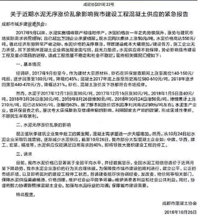 成都市混凝土協(xié)會(huì)給成都市城鄉(xiāng)建設(shè)委員會(huì)提交了《關(guān)于近期水泥無(wú)序漲價(jià)亂象影響我市建設(shè)工程混凝土供應(yīng)的緊急報(bào)告》(成砼協(xié)「2018」23號(hào))稱:水泥實(shí)施錯(cuò)峰限產(chǎn)和臨時(shí)停產(chǎn),水泥價(jià)格在一年之內(nèi)持續(xù)飆升,漲勢(shì)與建筑市場(chǎng)實(shí)際需求狀況脫鉤,且已超出下游企業(yè)承受極限。