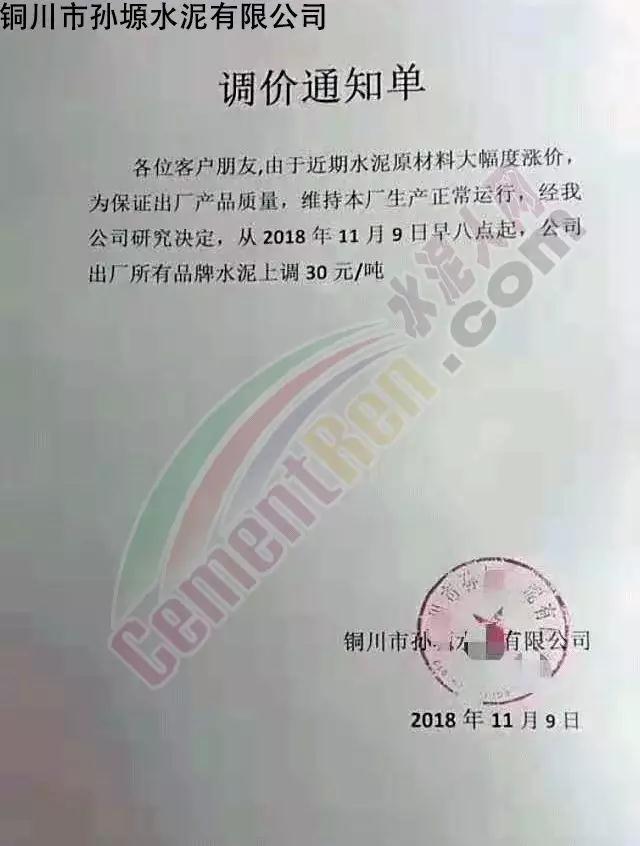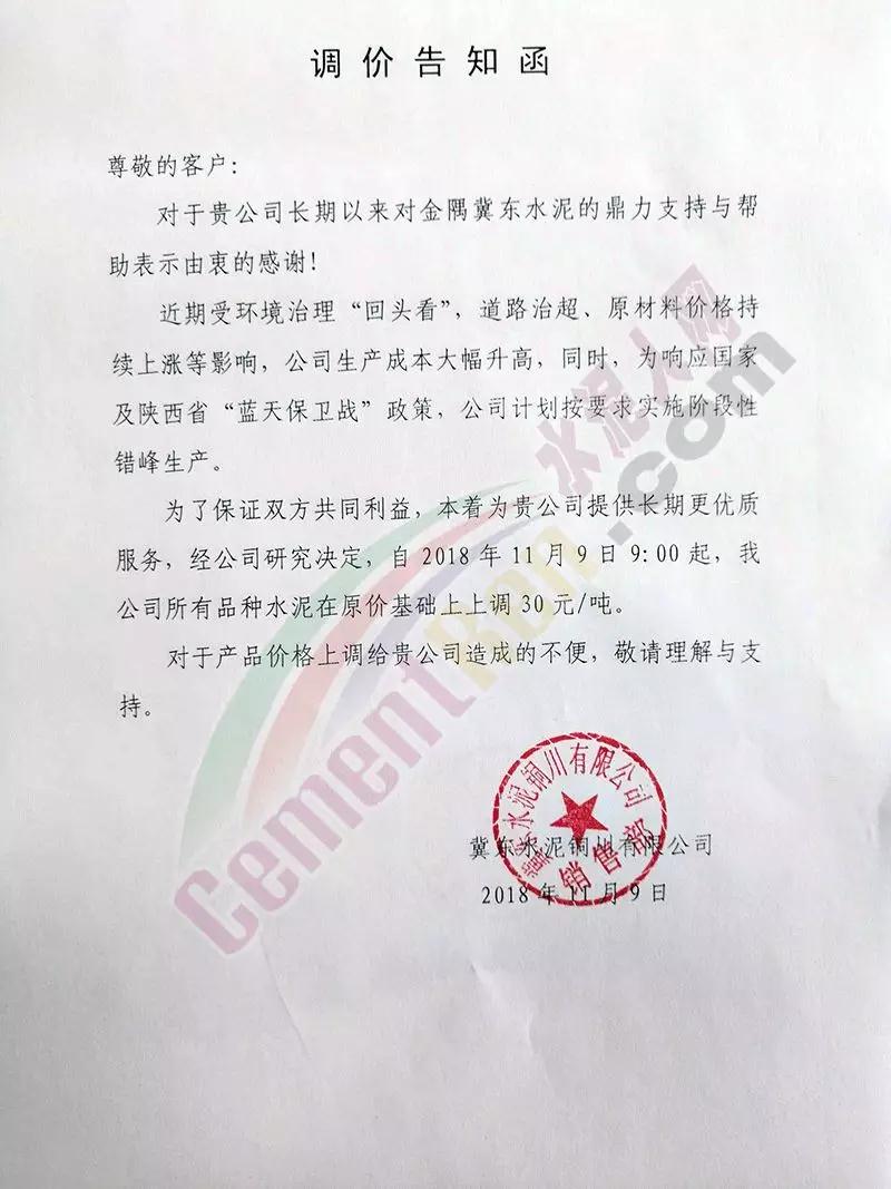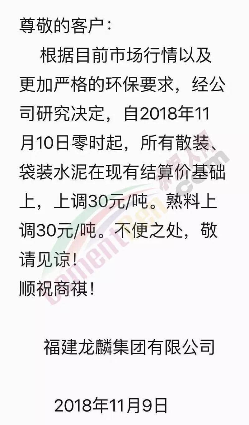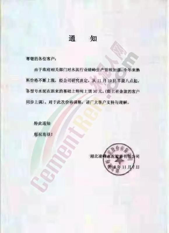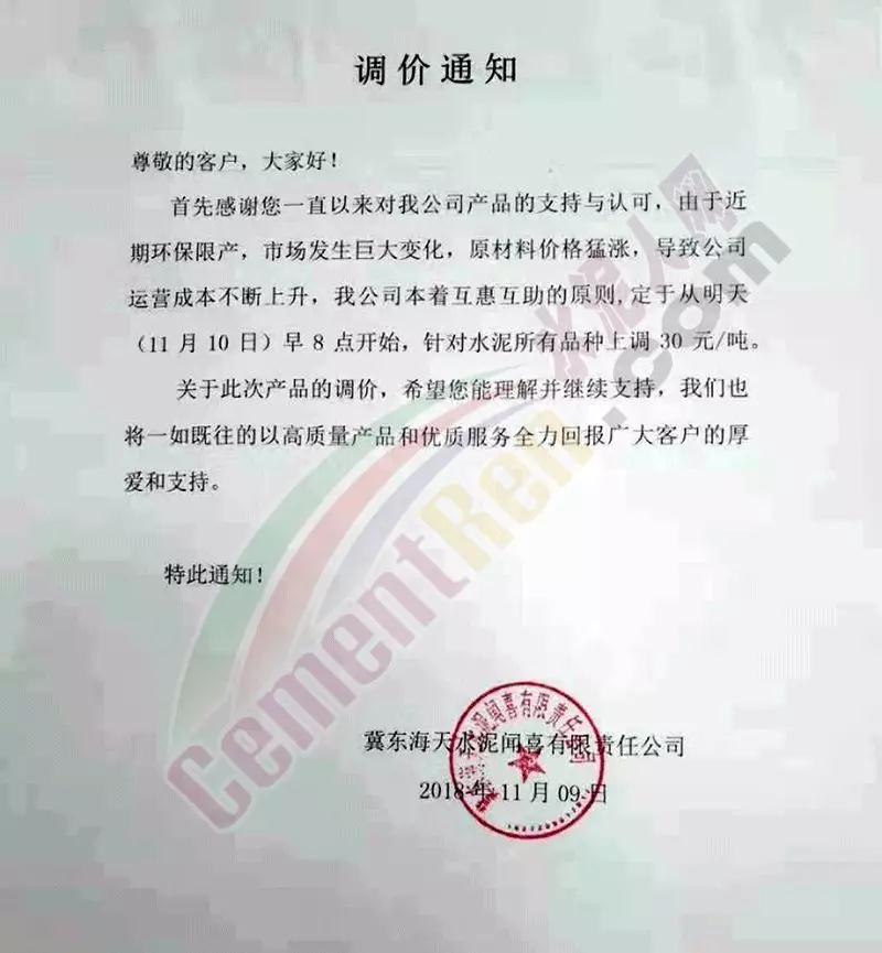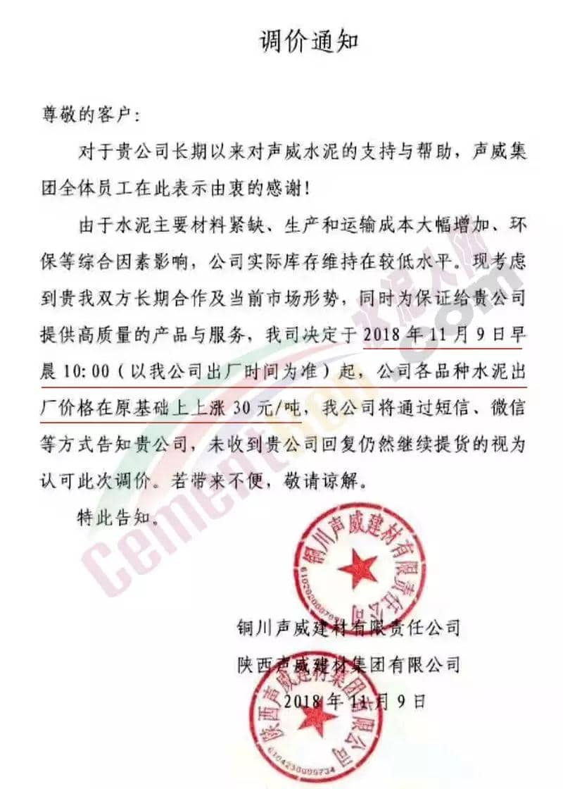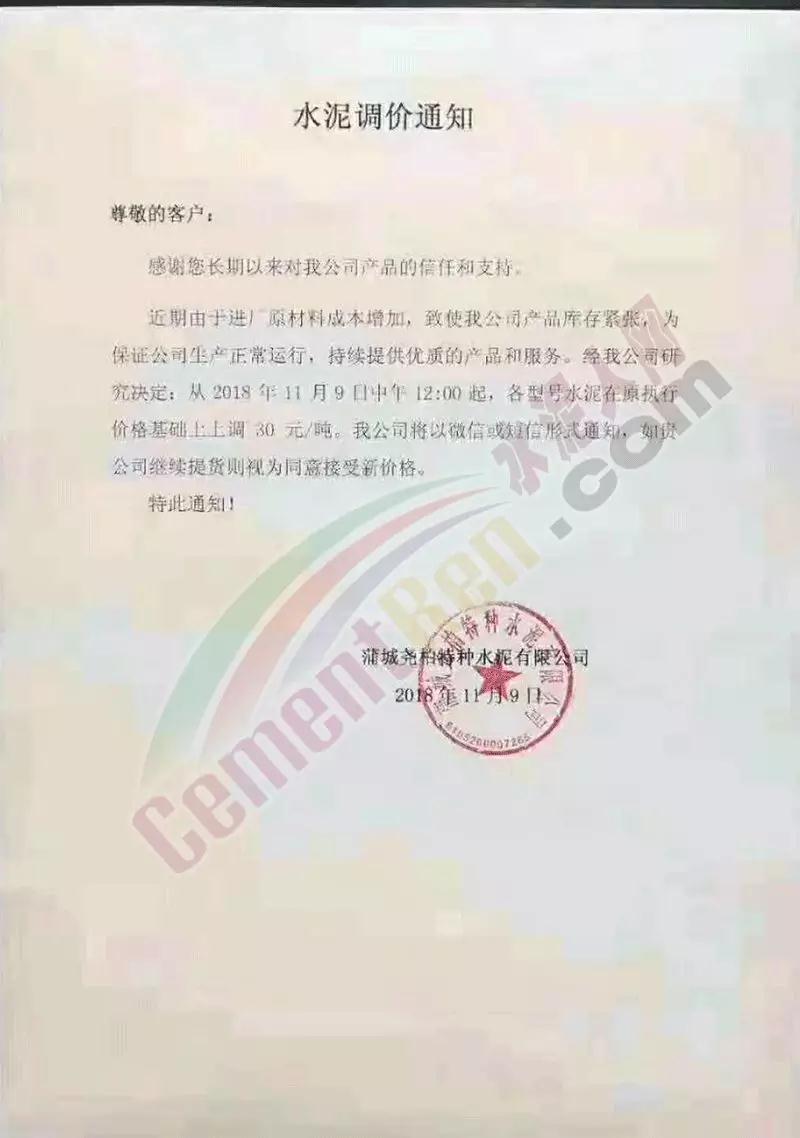 通過(guò)市場(chǎng)調(diào)研,結(jié)合本公司水泥生產(chǎn)成本,經(jīng)公司研究決定,從2018年11月10日零點(diǎn)起,我公司對(duì)銷往本區(qū)域各種型號(hào)散裝、袋裝水泥,在現(xiàn)行價(jià)格基礎(chǔ)上上調(diào)30元/噸。