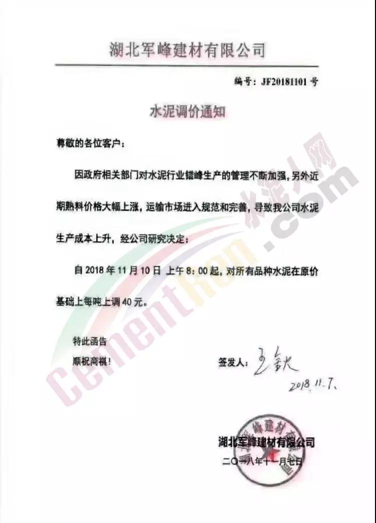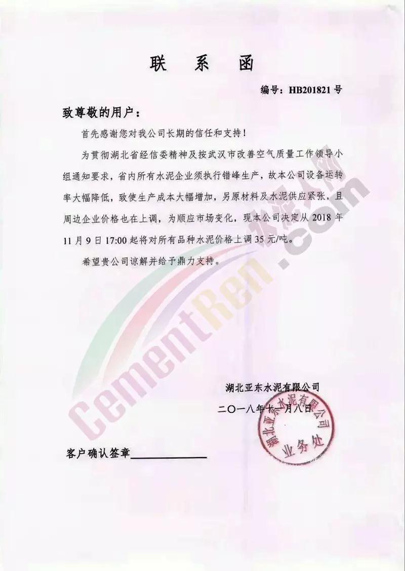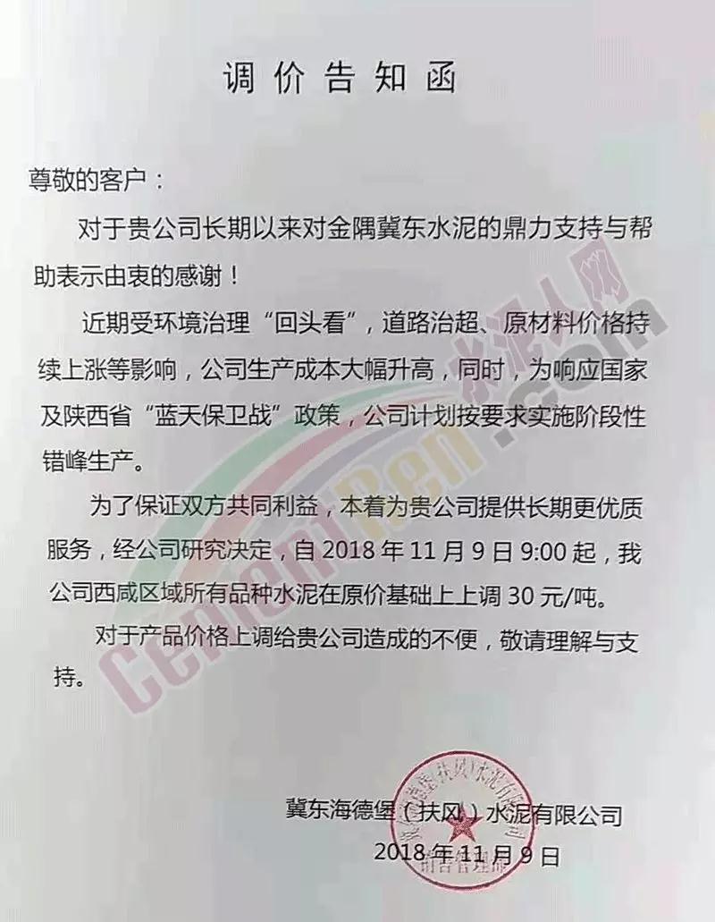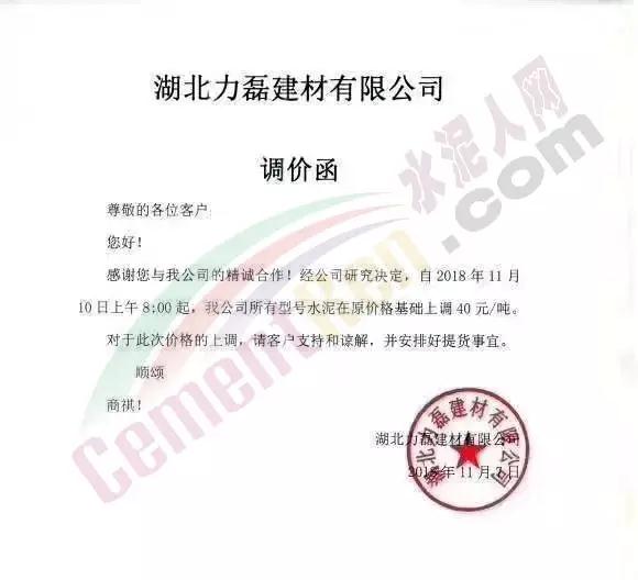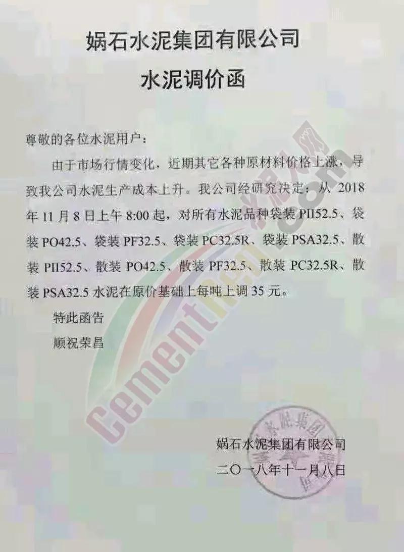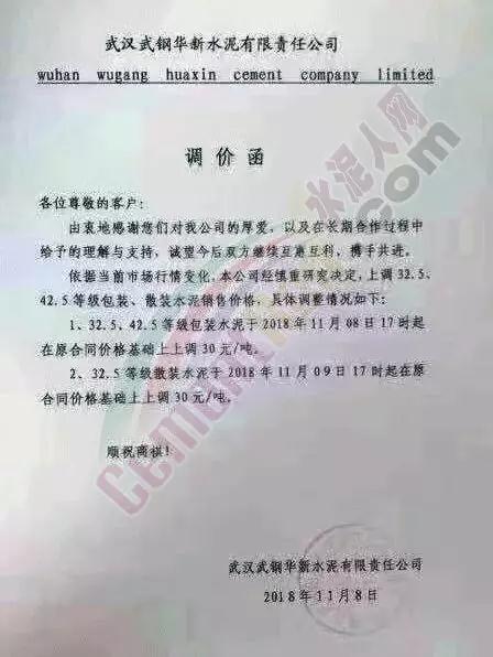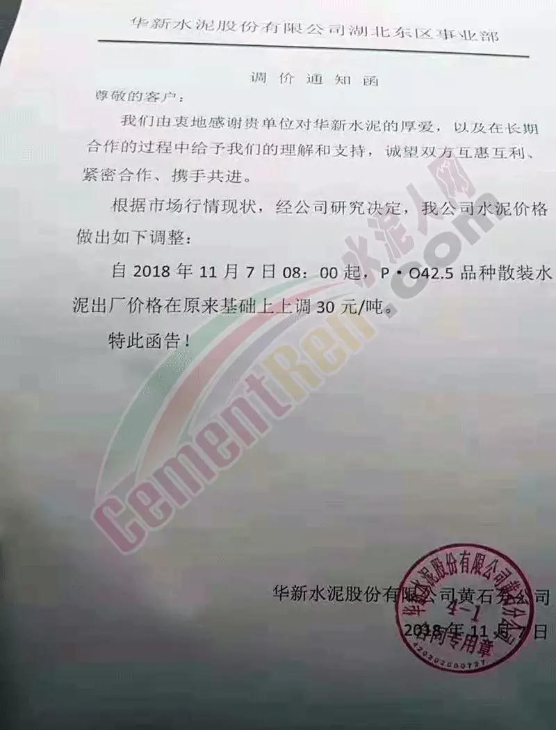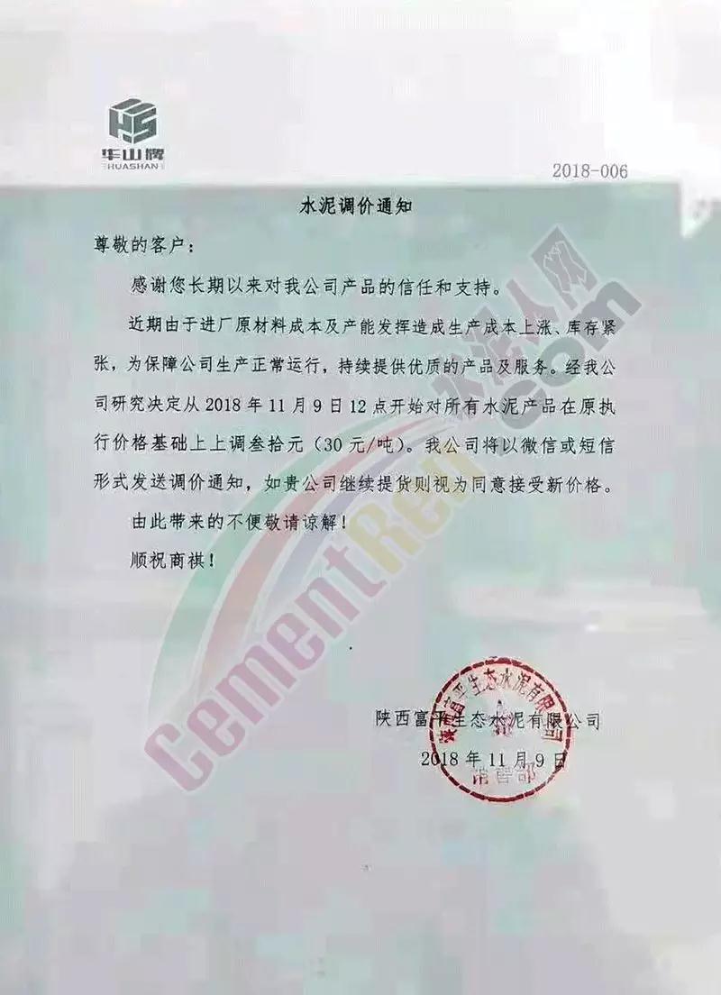 通過(guò)市場(chǎng)調(diào)研,結(jié)合本公司水泥生產(chǎn)成本,經(jīng)公司研究決定,從2018年11月10日零點(diǎn)起,我公司對(duì)銷往本區(qū)域各種型號(hào)散裝、袋裝水泥,在現(xiàn)行價(jià)格基礎(chǔ)上上調(diào)30元/噸。