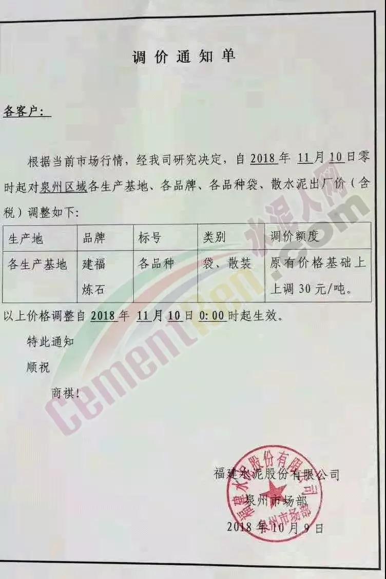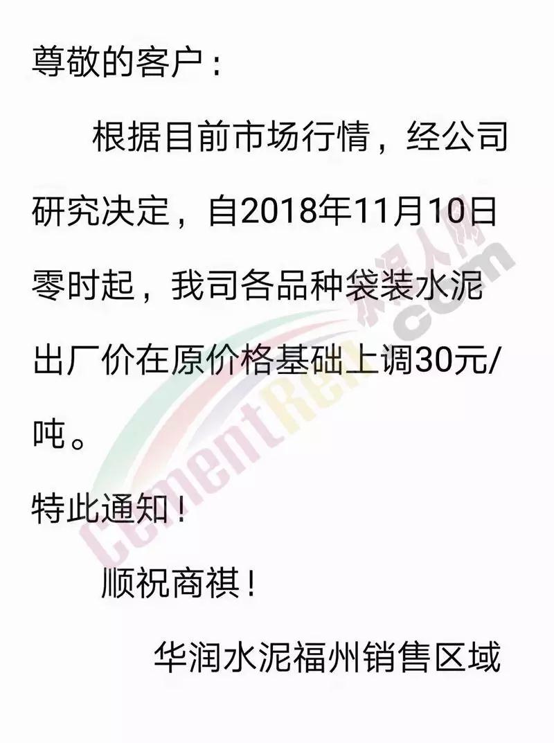 感謝您一直以來(lái)對(duì)我司的大力支持, 根據(jù)目前市場(chǎng)行情,經(jīng)公司研究決定,自2018年11月10日零時(shí)起,我司發(fā)往福建省內(nèi)各區(qū)域的袋裝、散裝水泥的出廠價(jià)格在原來(lái)的價(jià)格基礎(chǔ)上上調(diào)30元/噸。