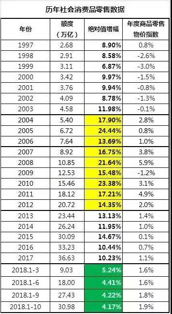 歷年社會消費品零售數(shù)據(jù)顯示額度方面也有所下降,絕對值增幅今年較前幾年有所下降。年度商品零售物價指數(shù)較前五年有所上漲, 詳情見下表: