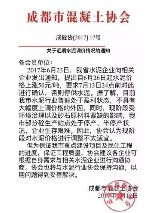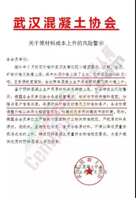 同期湖北武漢混凝土協會發出倡議書稱,因水泥等原材料無序暴漲致使混凝土行業采取一些維權手段,武漢混凝土協會一直呼吁會員單位應當采取正當合法渠道維護行業權益,積極向政府部門反映行業訴求。