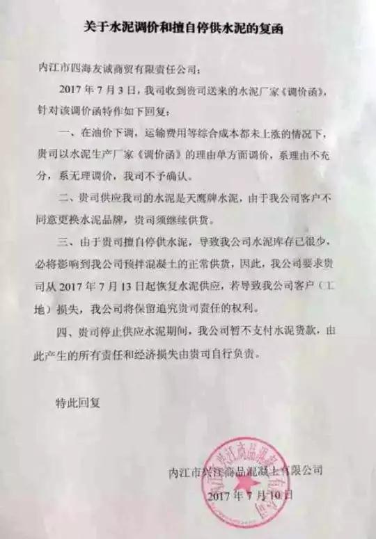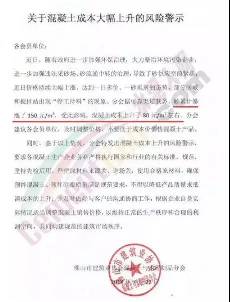 信件指出,“水泥企業無序漲價,引發市場混亂”,“且告知混凝土企業,如不在漲價函上簽字確認,將予以停止水泥供應,此舉還從側面引發了預拌混凝土其他原材料(如粉煤灰、礦粉等)的漲價趨勢,對本來已經岌岌可危的混凝土企業造成致命一擊。”