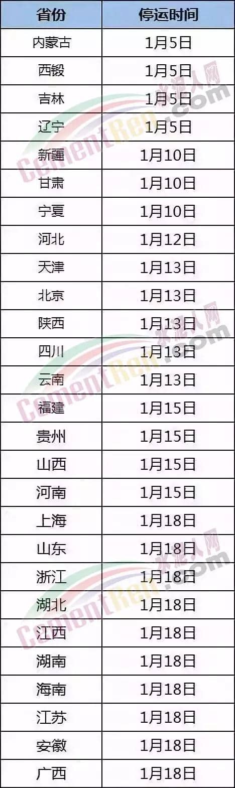 內蒙古,西藏,吉林,遼寧等地1月5日停運,新疆,甘肅,寧夏等地1月10日停運。河北1月12日停運,天津,北京,陜西,四川,云南等地1月13日停運。福建,貴州,山西,河南等地1月15日停運。上海,山東,浙江,湖北,江西,湖南,海南,江蘇,安徽,廣西等地1月18日停運。