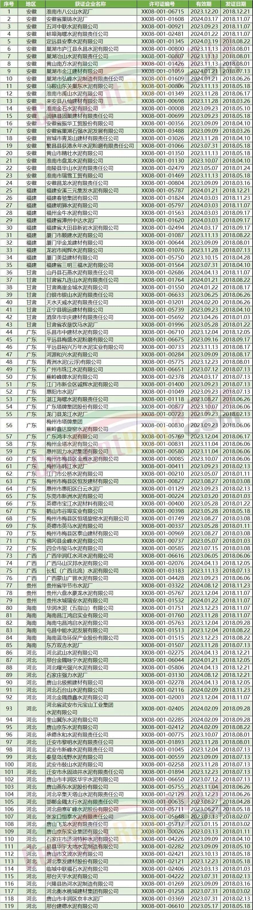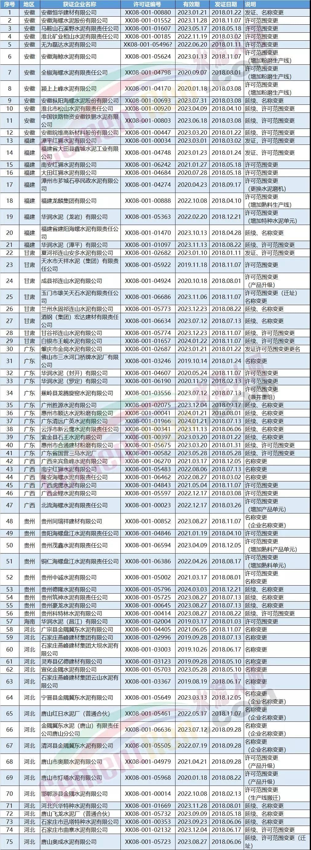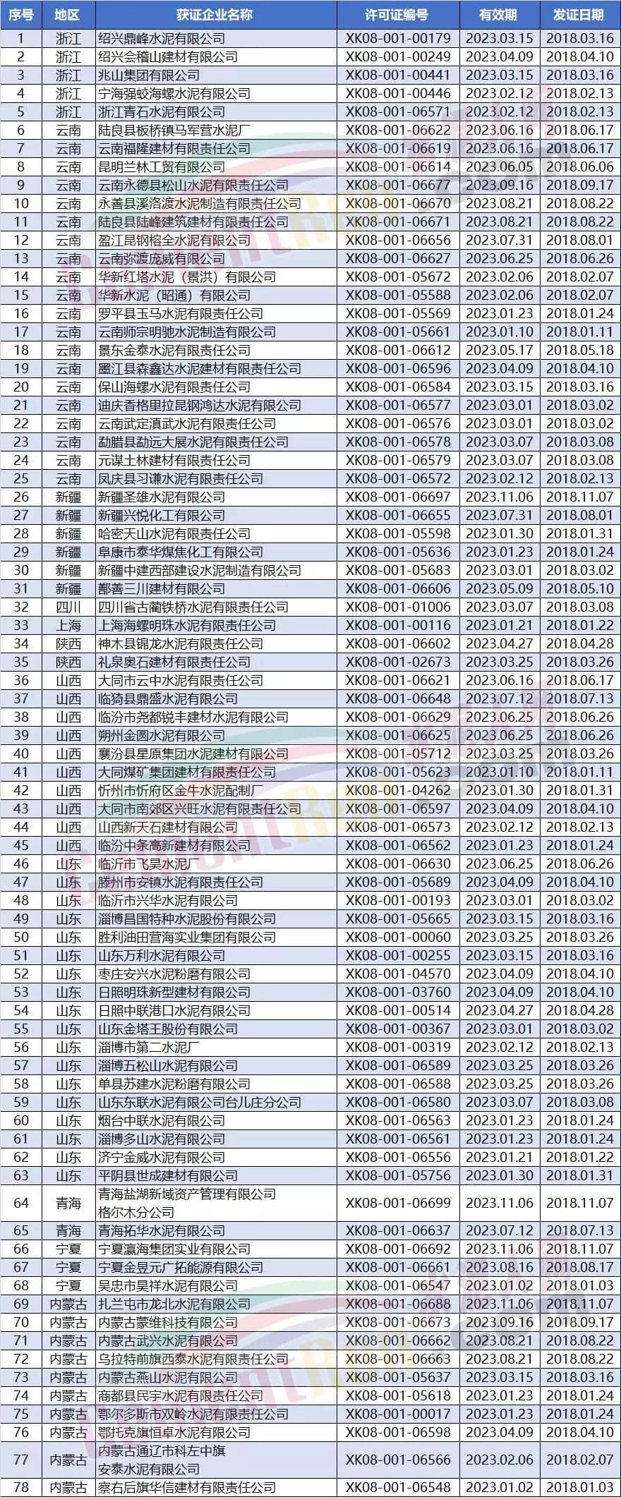 內蒙、山西、河北各發放10個編號水泥企業生產許可證。福建、甘肅 、廣西、寧夏、青海 、新疆、貴州、河南 、湖南、湖北、浙江、上海、遼寧、吉林、黑龍江、江蘇、江西、山東、陜西、四川等區域也有新發證書。