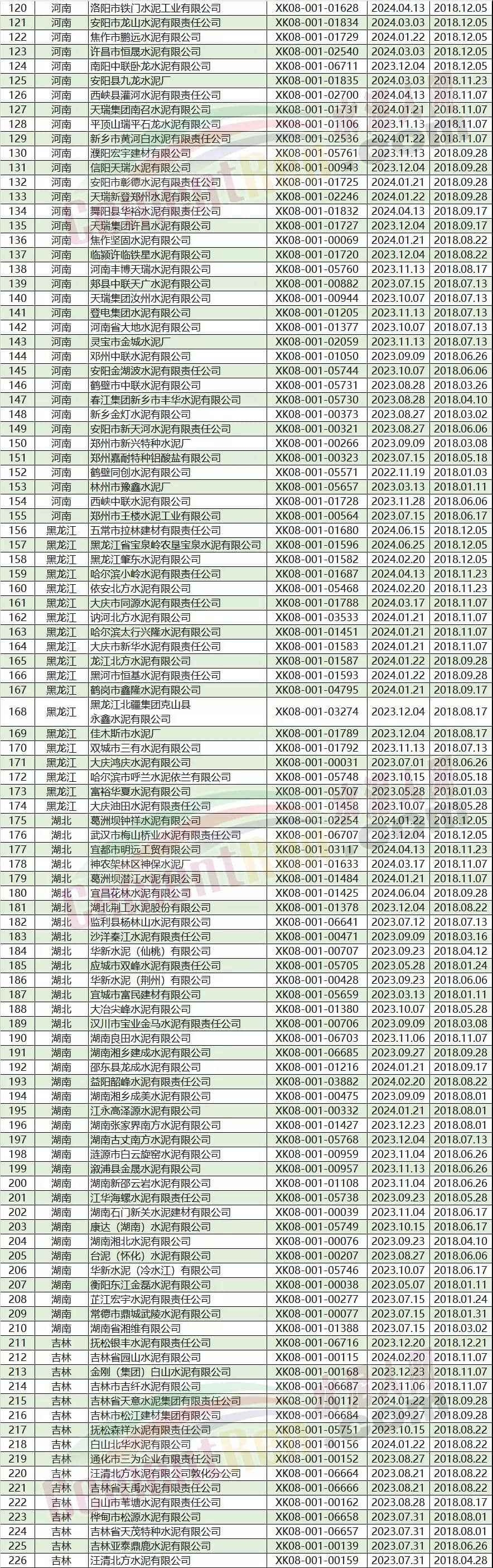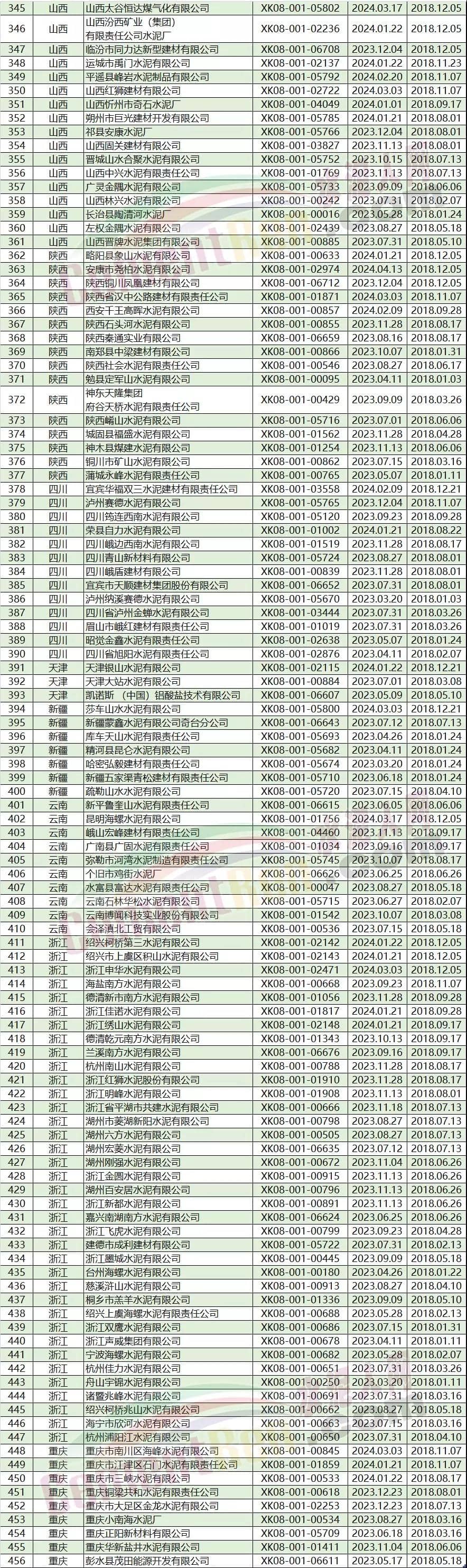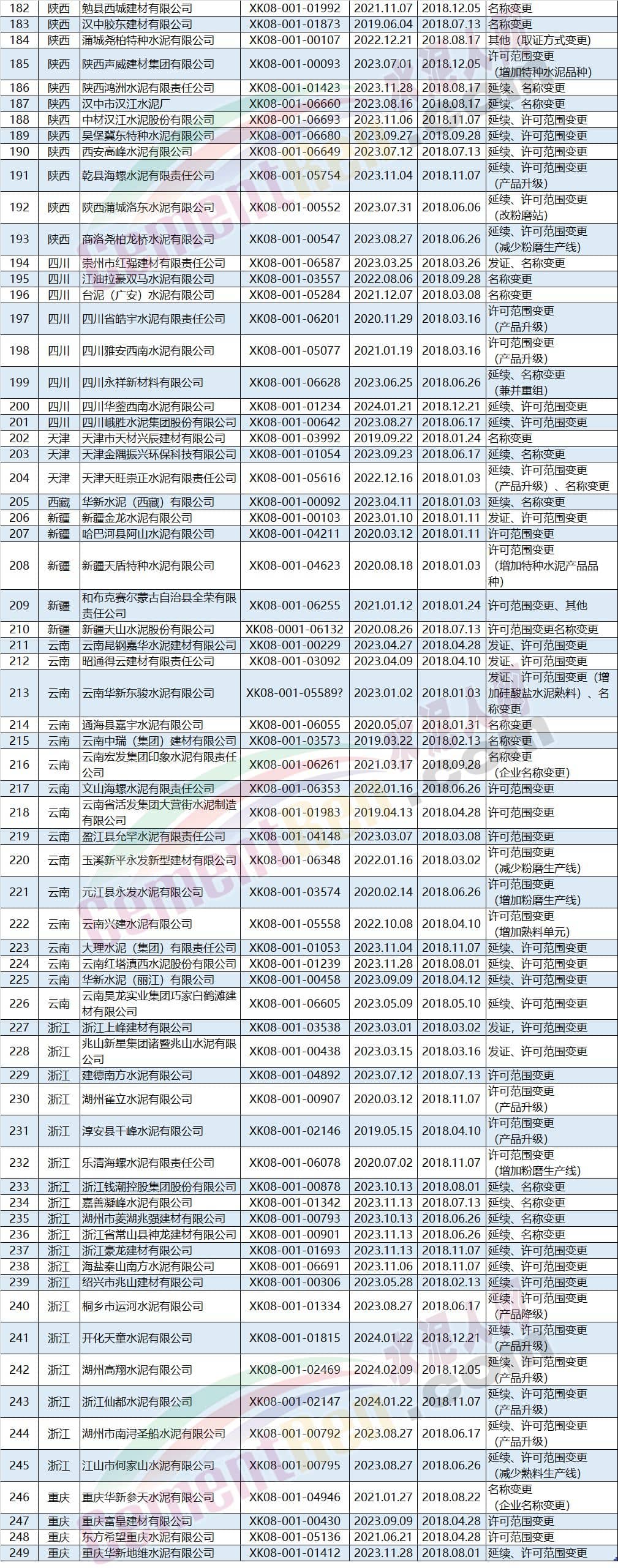 內蒙、山西、河北各發放10個編號水泥企業生產許可證。福建、甘肅 、廣西、寧夏、青海 、新疆、貴州、河南 、湖南、湖北、浙江、上海、遼寧、吉林、黑龍江、江蘇、江西、山東、陜西、四川等區域也有新發證書。