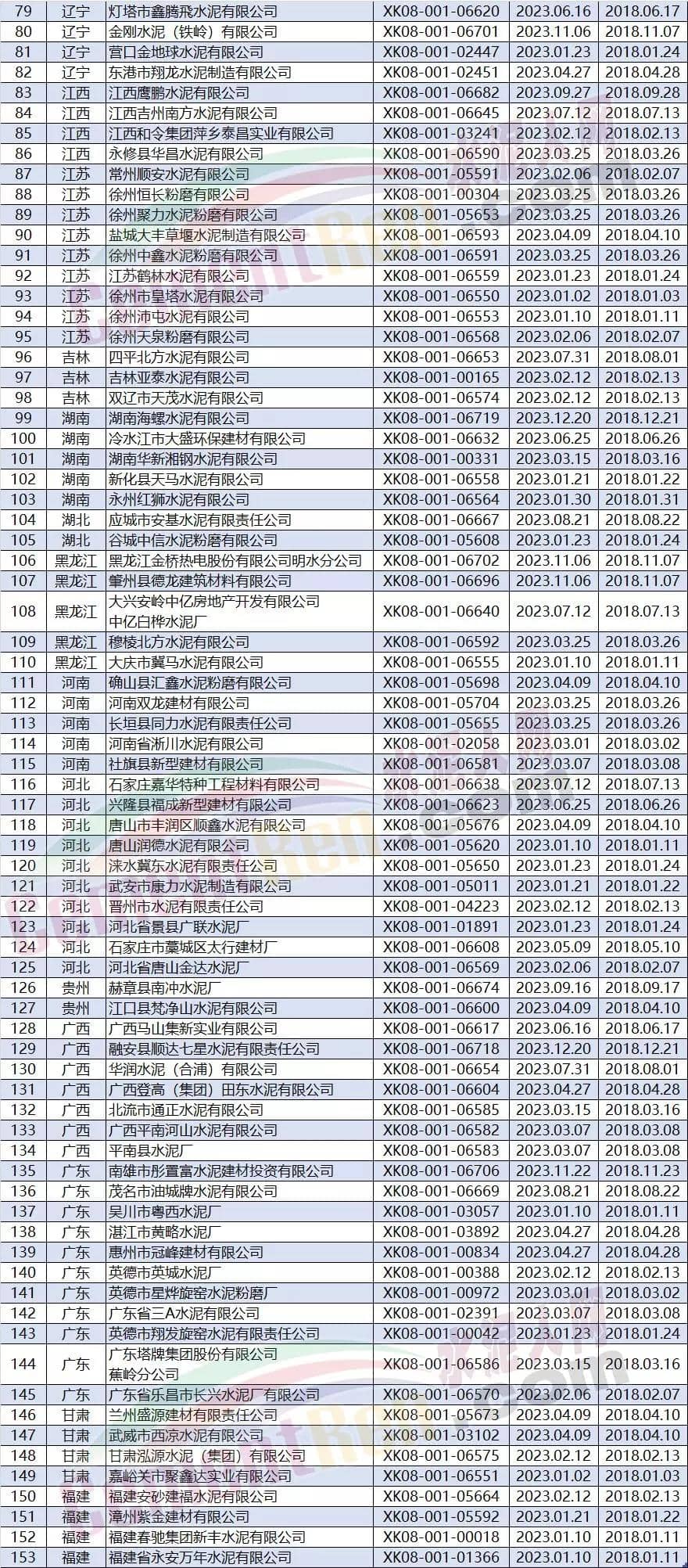 據水泥人網了解新版《水泥產品生產許可證實施細則》于2018年12月1日正式實施。上述列表中的153家企業,有一部分是因證書到期未延續被注銷后又重新申請的,還有一部分是新建生產線第一次申領水泥產品生產許可證書。詳情如下:
