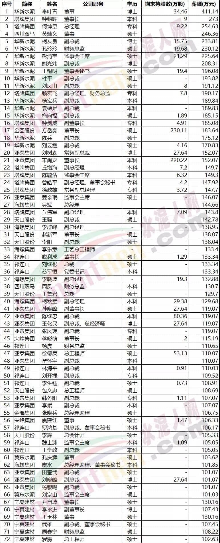 據水泥人網通訊員反饋,水泥行業企業在每年年初都會依據上年業績制定出相應的任務計劃,企業高管完成或超額完成年度計劃的,將也會獲得一筆不菲的獎金,金額從幾十萬到幾百萬元不等,所以水泥行業各位高管或將拿到歷史上“最高”年薪。