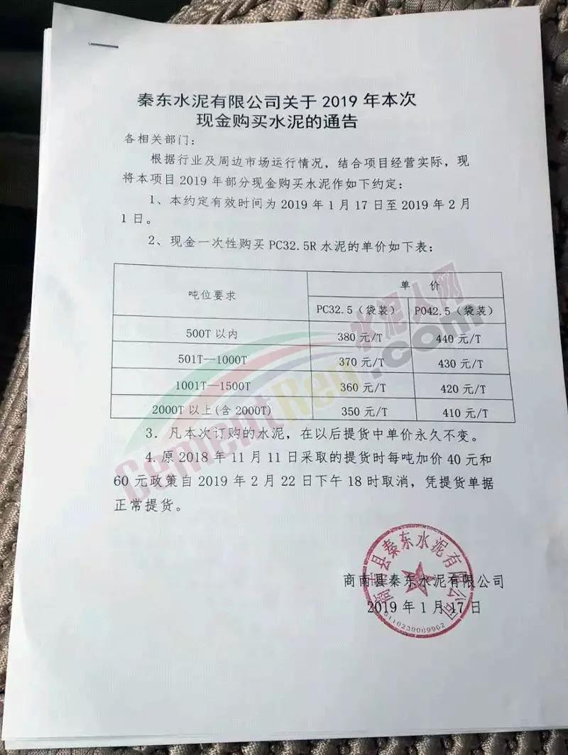 通告里還提到本次訂購的水泥,在以后的提貨中單價永久不變。