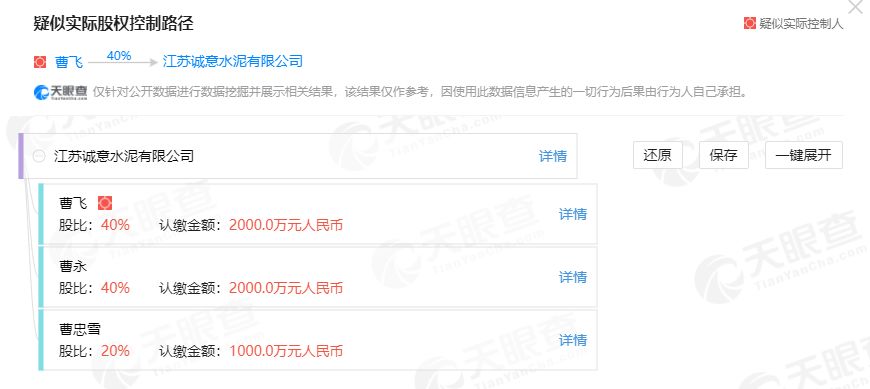 天眼查數據顯示,江蘇誠意水泥有限公司法定代表人曹忠雪,其擁有公司20%的股份。