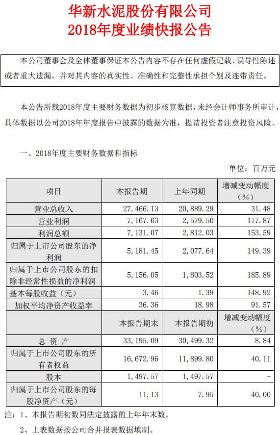 3月2日,華新水泥股份有限公司公布了2018年度快報(bào)公告,公司2018年度營(yíng)業(yè)總收入274.66億元,同比增長(zhǎng)31.48%;凈利潤(rùn)51.81億元,同比增長(zhǎng)149.39%;基本每股收益3.46元。