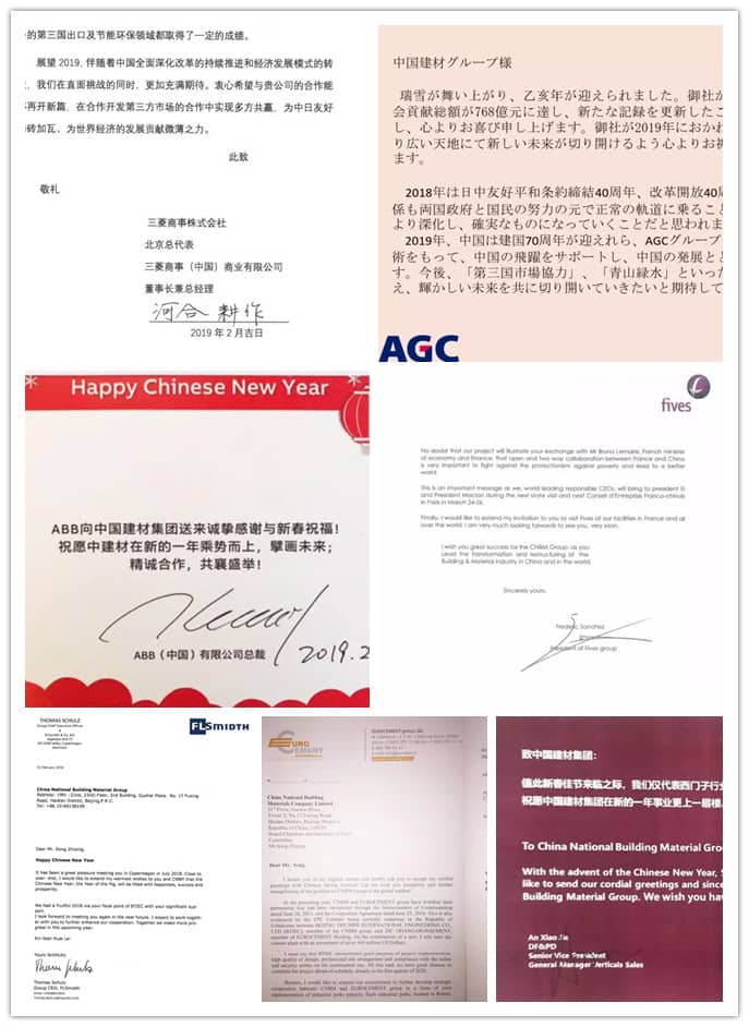 中國(guó)建材集團(tuán)海外合作伙伴寄語(yǔ)集團(tuán)2019年發(fā)展,其中既有擁有幾十年合作歷史的老朋友,也有在2018年結(jié)識(shí)的新朋友;既有基石業(yè)務(wù)持續(xù)推進(jìn)中的支持者,也有三新產(chǎn)業(yè)開(kāi)拓征途上的同行者。寄語(yǔ)中包含了對(duì)以往合作業(yè)績(jī)上的總結(jié)和感恩,也有對(duì)未來(lái)深入合作的思考和期待。
