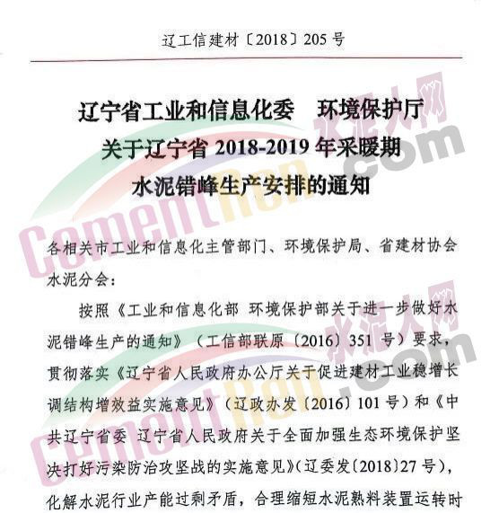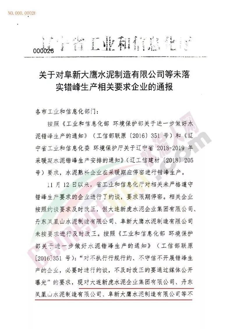 2018年11月10日遼寧省工信廳曾對大鷹水泥等企業未落實錯峰生產相關要求企業做出公開通報,通報原文如下:
