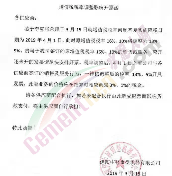 也就是說自下月1日起,一般納稅人發生的增值稅應稅銷售行為,適用稅率由16%調整成13%。這一惠民政策一經發布,頓時在水泥行業里形成熱議,尤其是水泥銷售群體,部分下游客戶直接向企業銷售部提出水泥價格降3個點。一時間水泥銷售也懵了,頓時腦子里冒出了N多問號?