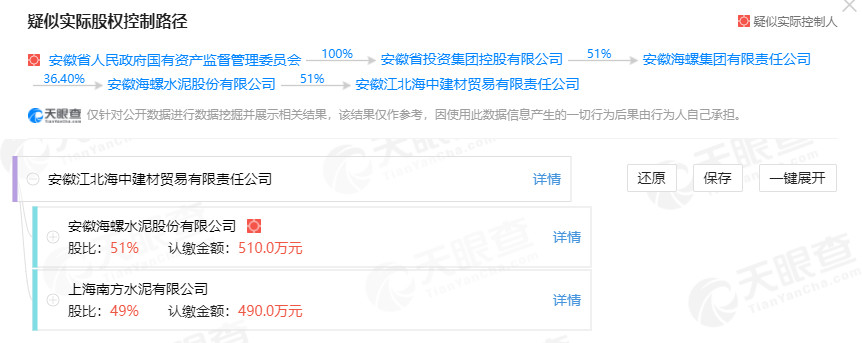 2018年3月安徽海螺水泥股份有限公司和中建材旗下上海南方水泥有限公司共同出資組建了安徽江北海中建材貿(mào)易有限責(zé)任公司,安徽海螺水泥占比51%,上海南方水泥占比49%。