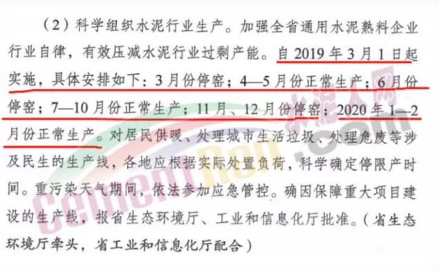 文件要求水泥行業(yè)科學(xué)組織生產(chǎn),加強(qiáng)水泥熟料企業(yè)自律,有效壓減水泥行業(yè)過剩產(chǎn)能。自3月1日起停窯限產(chǎn),4、5月正常生產(chǎn),6月停限,7-10月正常生產(chǎn),11、12月停窯。共計停限4個月,加上2019年1、2月份的停窯限產(chǎn),河南省2019年也要停限產(chǎn)6個月(180天)以上。