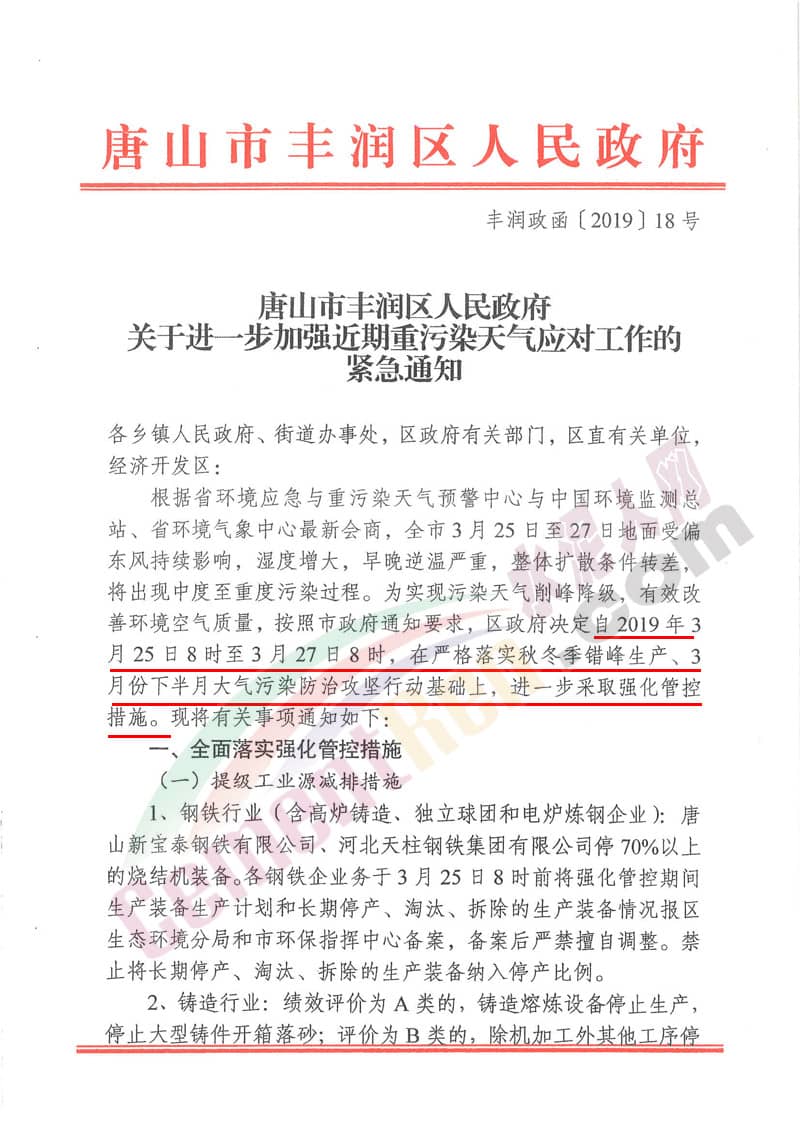 河北省唐山市,這個京津冀地區(qū)的“水泥窩”,一遇到重污染天氣就發(fā)布緊急通知。昨日(3月25日),唐山市豐潤區(qū)人民政府發(fā)布豐潤政函【2019】18號文件《關(guān)于進(jìn)一步加強(qiáng)近期重污染天氣應(yīng)對工作的緊急通知》要求自3月25日至3月27日,在嚴(yán)格落實秋冬季錯峰生產(chǎn),3月份下半月大氣污染攻堅行動基礎(chǔ)上,進(jìn)一步采取強(qiáng)化管控措施。