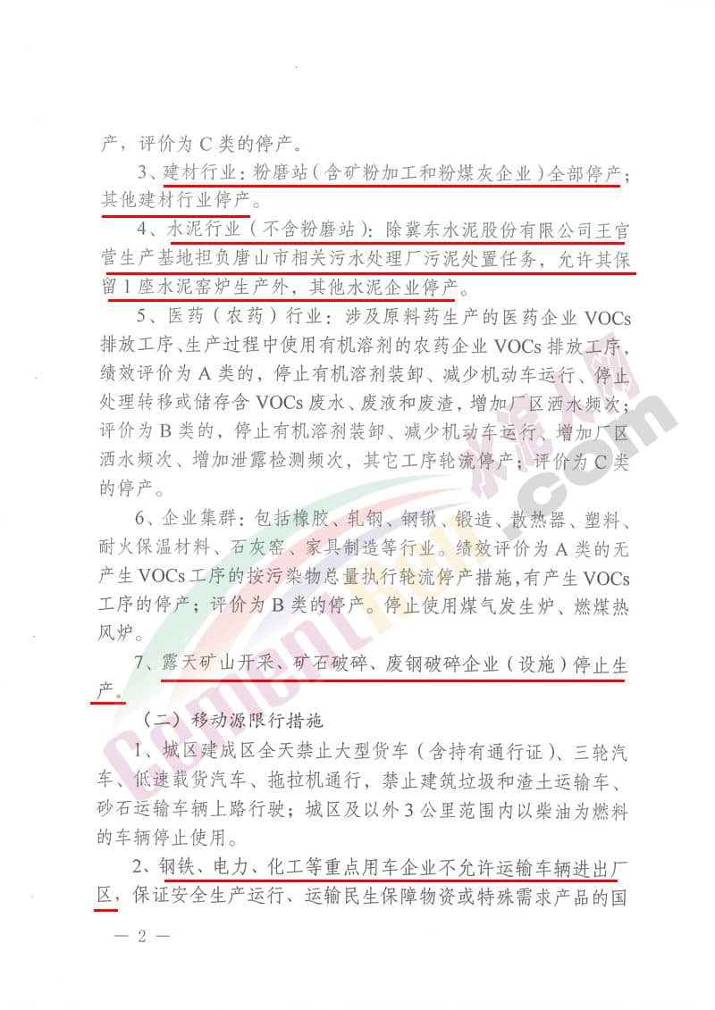 上個月底,2月28日唐山市人民政府曾發(fā)布《關(guān)于啟動重污染天氣Ⅰ級應(yīng)急響應(yīng)的通知》要求建材行業(yè)。粉磨站停產(chǎn);水泥行業(yè)(不含粉磨站)。符合《關(guān)于建立重點行業(yè)超低排放(深度治理)示范引領(lǐng)制度的通知》(冀氣領(lǐng)辦〔2018〕128號)要求的,不予管控;協(xié)同處置城市垃圾(含污泥)或危險廢物等保民生任務(wù)的,可根據(jù)承擔(dān)任務(wù)量核定最大允許生產(chǎn)負(fù)荷生產(chǎn);承擔(dān)居民供暖的,根據(jù)承擔(dān)任務(wù)量核定最大允許生產(chǎn)負(fù)荷生產(chǎn)。其他企業(yè)停產(chǎn)。