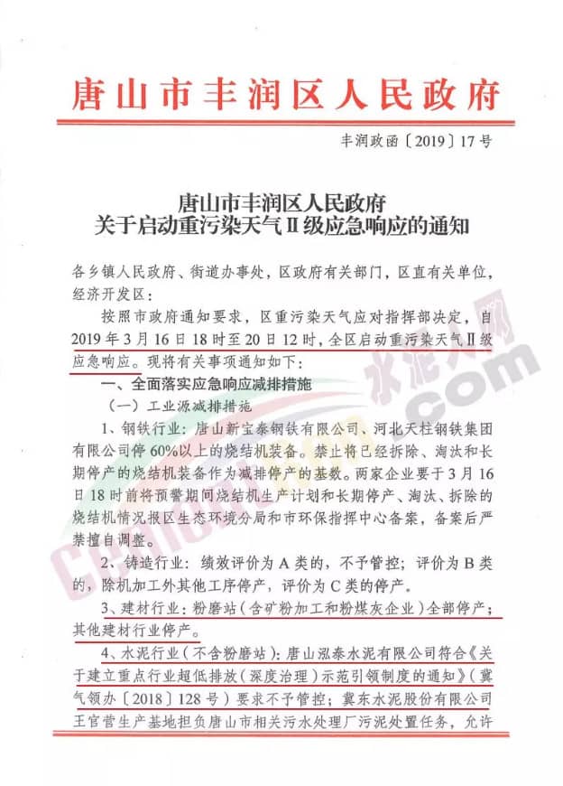 這已經(jīng)是進(jìn)入3月后的第二次臨停了。3月16日,豐潤區(qū)人民政府辦公室曾發(fā)布【2019】17號文件《關(guān)于啟動重污染天氣II級應(yīng)急響應(yīng)的通知》,要求自3月16日18時至20日12時,全區(qū)啟動重污染天氣II級響應(yīng)措施,建材行業(yè)粉磨站(含礦粉加工和粉煤灰企業(yè))全部停產(chǎn)。水泥行業(yè)(不含粉磨站)唐山泓泰水泥有限公司污染符合相關(guān)要求不予管控、冀東水泥王官營生產(chǎn)基地?fù)?dān)負(fù)污水處理長污泥處置任務(wù),允許運行2條生產(chǎn)線。唐山飛龍有限責(zé)任公司,唐山燕東水泥有限責(zé)任公司根據(jù)承擔(dān)供暖任務(wù)核實最大生產(chǎn)。其他企業(yè)停產(chǎn)。