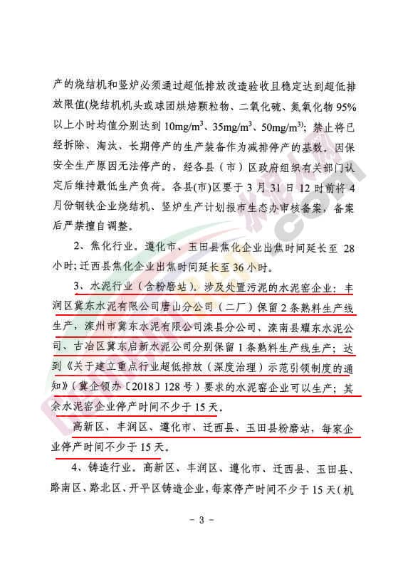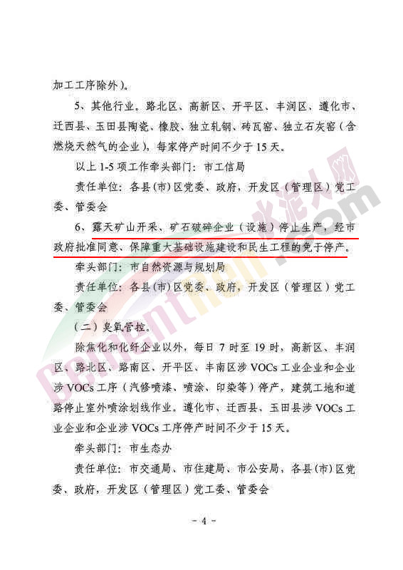 ⑸高新區、豐潤區、遵化市、遷西縣、玉田縣粉磨站,每家企業停產時間不少于15天。