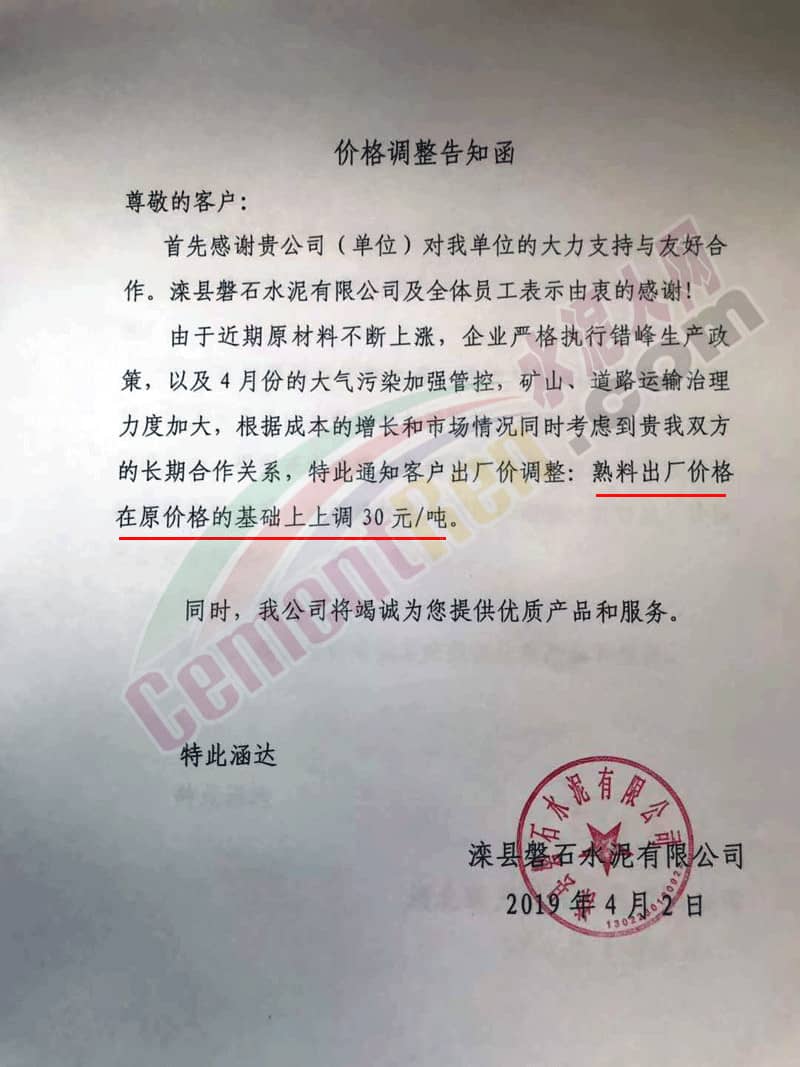 昨日(4月2日)河北曙光強興水泥有限公司及灤縣磐石水泥有限公司分別發(fā)布價格調整告知函稱:由于近期原材料不斷上漲,企業(yè)嚴格執(zhí)行錯峰生產(chǎn)政策,以及4月份的大氣污染加強管控,礦山、道路運輸治理力度加大,根據(jù)成本的增長和市場情況,企業(yè)熟料出廠價格在原價格基礎上上調30元/噸。