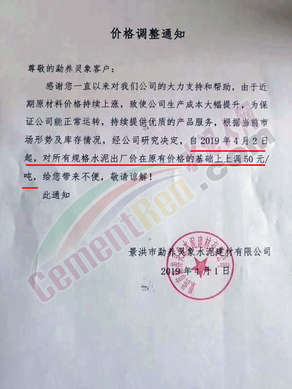 昨日(4月2日)云南區(qū)域企業(yè)也有通知上調水泥價格。其中景洪市勐養(yǎng)靈象水泥建材有限公司價格調整通知稱,由于近期原材料價格持續(xù)上漲,致使公司生產(chǎn)成本大幅提升,為保證公司正常運轉,持續(xù)提供優(yōu)質的產(chǎn)品和服務,根據(jù)當前市場形勢及企業(yè)庫存情況,經(jīng)公司研究決定 ,自4月2日起對所有規(guī)格水泥出廠價在原有價格的基礎上上調50元/噸。