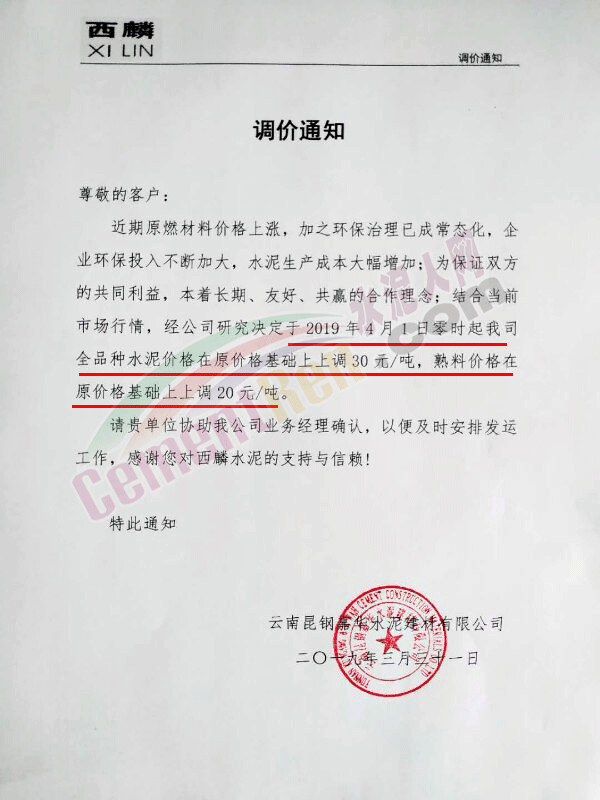 4月1日,云南區(qū)域多家主導企業(yè)發(fā)布調價通知。其中云南昆鋼嘉華水泥建材有限公司調價通知稱,因近期原燃材料價格上漲,加之環(huán)保治理已成常態(tài)化,企業(yè)環(huán)保投入不斷加大,水泥生產(chǎn)成本大幅增加;為保證雙方的共同利益,結合當前市場行情,經(jīng)公司研究決定于4月1日零時起公司全品種水泥價硌在原價格基礎上上調30元/噸,熟料價格在原價格基礎上上調20元/噸。