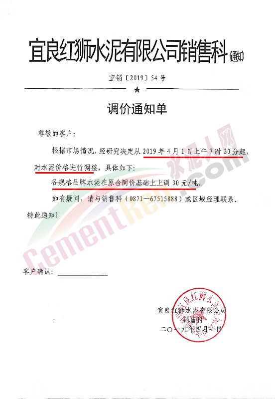 云南區(qū)域宜良紅獅水泥有限公司銷售科調價通知稱,自4月1日上午7時30分起,對水泥價格進行調整:各規(guī)格品牌水泥在原合同價基礎上上調30元/噸。