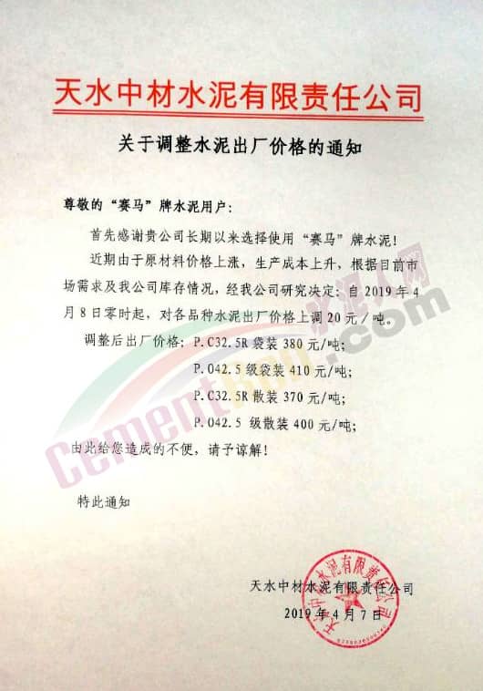 祁連山水泥天水公司通知自4月9日零時(shí)起對(duì)甘谷公司各品種水泥出廠價(jià)在原價(jià)格基礎(chǔ)上上調(diào)20元/噸。對(duì)成縣公司發(fā)往天水市場(chǎng)的各品種水泥出廠價(jià)格在原價(jià)格基礎(chǔ)上上調(diào)20元/噸。