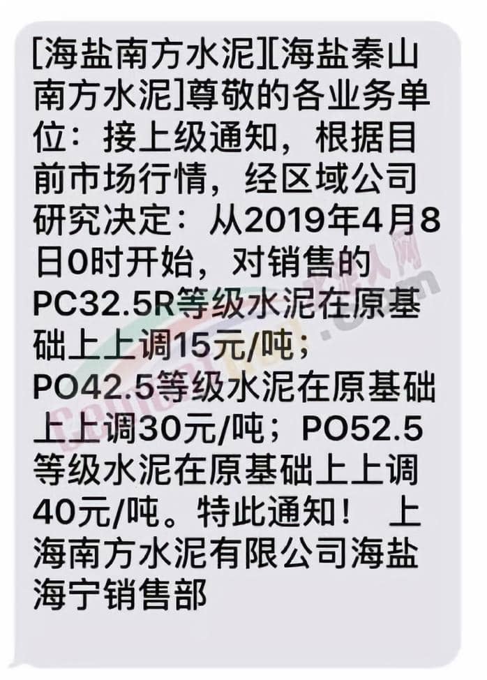 同期海鹽南方水泥,海鹽秦山南方水泥發(fā)布通知稱(chēng),根據(jù)目前市場(chǎng)行情,經(jīng)研究決定:從4月8日0時(shí)起,對(duì)銷(xiāo)售PC32.5等級(jí)水泥在原基礎(chǔ)上上調(diào)15元/噸。PO42.5水泥在原基礎(chǔ)上上調(diào)30元/噸。PO52.5等級(jí)水泥在原基礎(chǔ)上上調(diào)40元/噸。