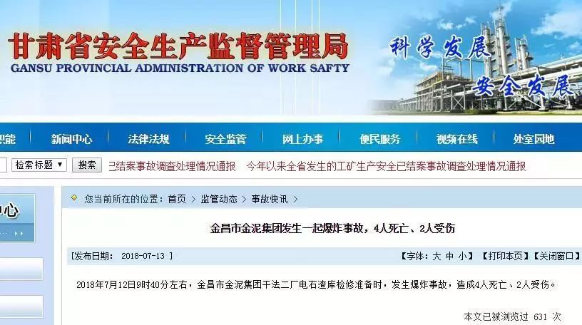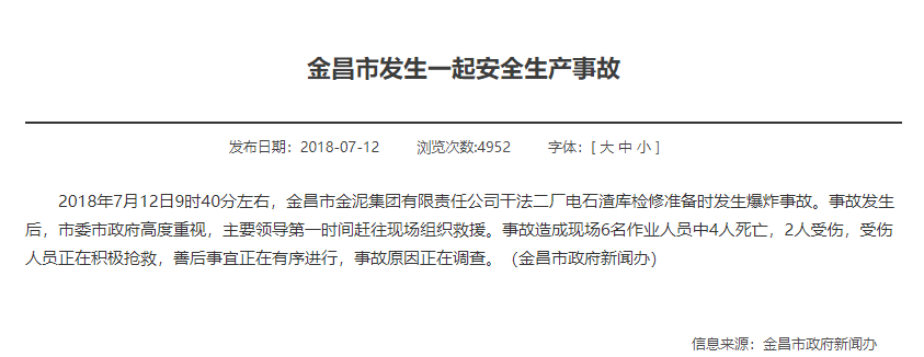 2018年7月12日9時40分左右,金昌水泥(集團)有限責任公司新型干法水泥二廠電石渣庫發生一起爆炸事故,造成現場4人死亡、2人受傷,直接經濟損失494萬元。后經調查認定金泥集團公司干法二廠“7.12”爆炸事故是由于違章指揮、違章作業導致的一起較大生產安全責任事故。
