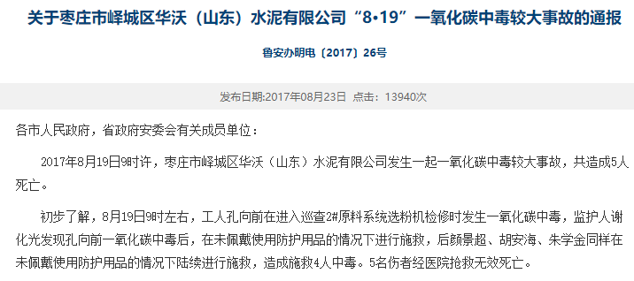 也是在山東省,2017年8月19日9時許,位于棗莊市嶧城區的華沃(山東)水泥有限公司原料車間在檢修過程中發生一起一氧化碳較大中毒事故,造成1人中毒,4人因施救不當中毒,5人經搶救無效死亡,直接經濟損失約699萬元。經調查認定,這是一起較大生產安全責任事故。