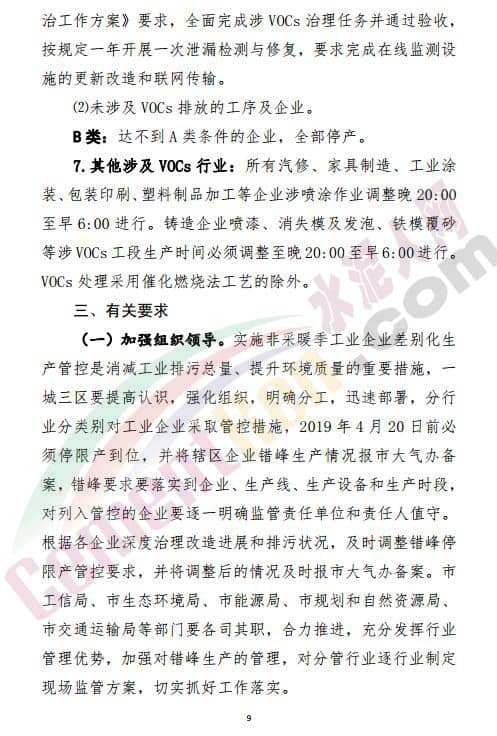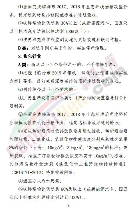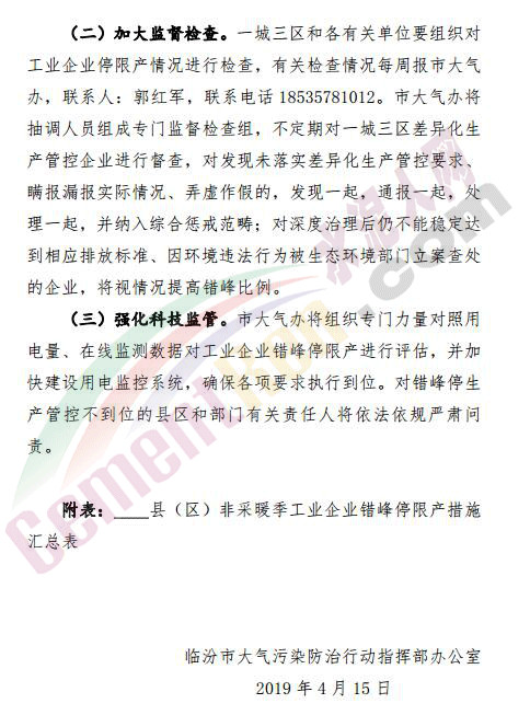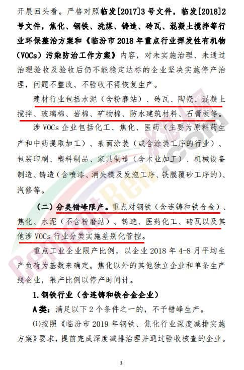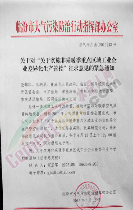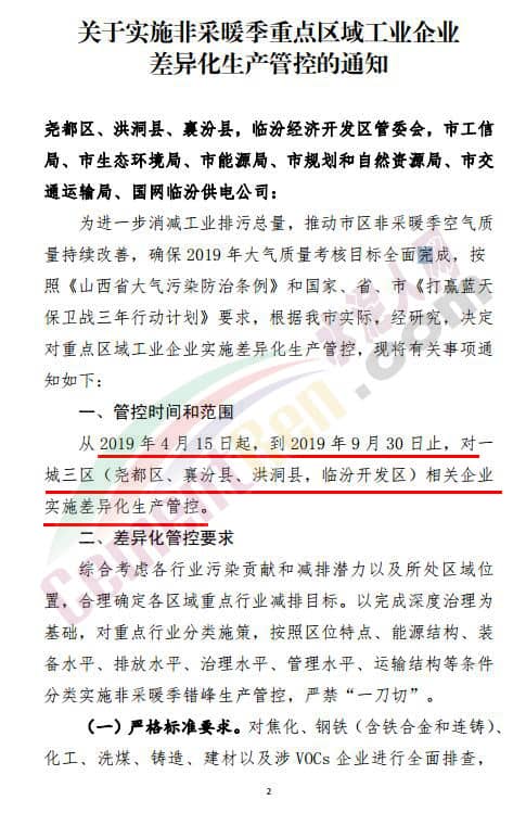 日前,山西臨汾市下達(dá)非采暖季重點(diǎn)區(qū)域差異化生產(chǎn)管控的通知,從2019年4月15日起,到2019年9月30日止,對一城三區(qū)(堯都區(qū)、襄汾縣、洪洞縣,臨汾開發(fā)區(qū))相關(guān)企業(yè)實(shí)施差異化生產(chǎn)管控。嚴(yán)格對照臨發(fā)[2017]3號文件, 臨發(fā)[2018]2號文件,焦化、鋼鐵、洗煤、鑄造、磚瓦、混凝土攪拌等行業(yè)環(huán)保整治方案和《臨汾市2018年重點(diǎn)行業(yè)揮發(fā)性有機(jī)物(VOCs)污染防治工作方案》。重點(diǎn)對鋼鐵(含連鑄和鐵合金)、焦化、水泥(不含粉磨站)、鑄造其他涉VOCs行業(yè)分類實(shí)施差別化管控。