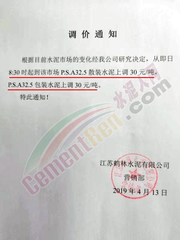 尊敬的客戶:您好!根據(jù)當(dāng)前市場行情,我公司于2019年4月13日8:00,對各品種水泥價(jià)格上調(diào)30元/噸。特此通知!