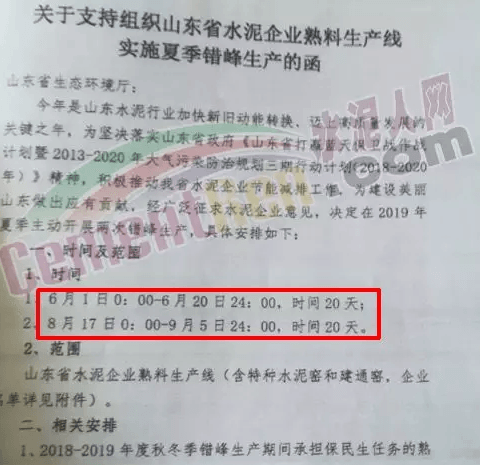 水泥人網消息,山東省2019年水泥企業(yè)熟料生產線(含特種水泥窯和建通窯)夏季錯峰時間已經確定,自6月1日起分兩個階段,共計停產40天,具體錯峰停產時間如下: