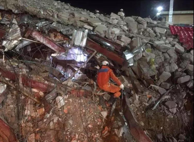現場圖片顯示,戴著安全帽的救援人員穿過地面上的鋼筋水泥,將傷者運送至救護車,同時挖掘機將倒塌后的建筑廢料分流到一邊。大量傷者的親屬則在事故地點附近等待消息。